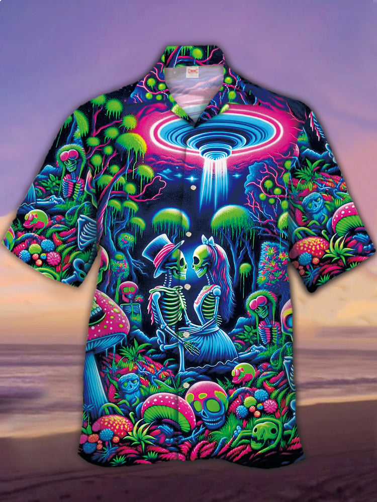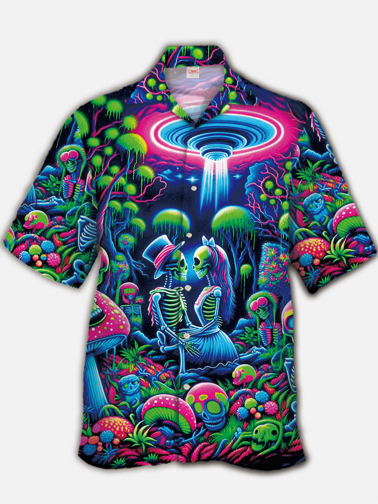 Eye-Catching Psychedelic Jellyfish And Skull Lovers Printing Cuban Collar Hawaiian Short Sleeve Shirt
