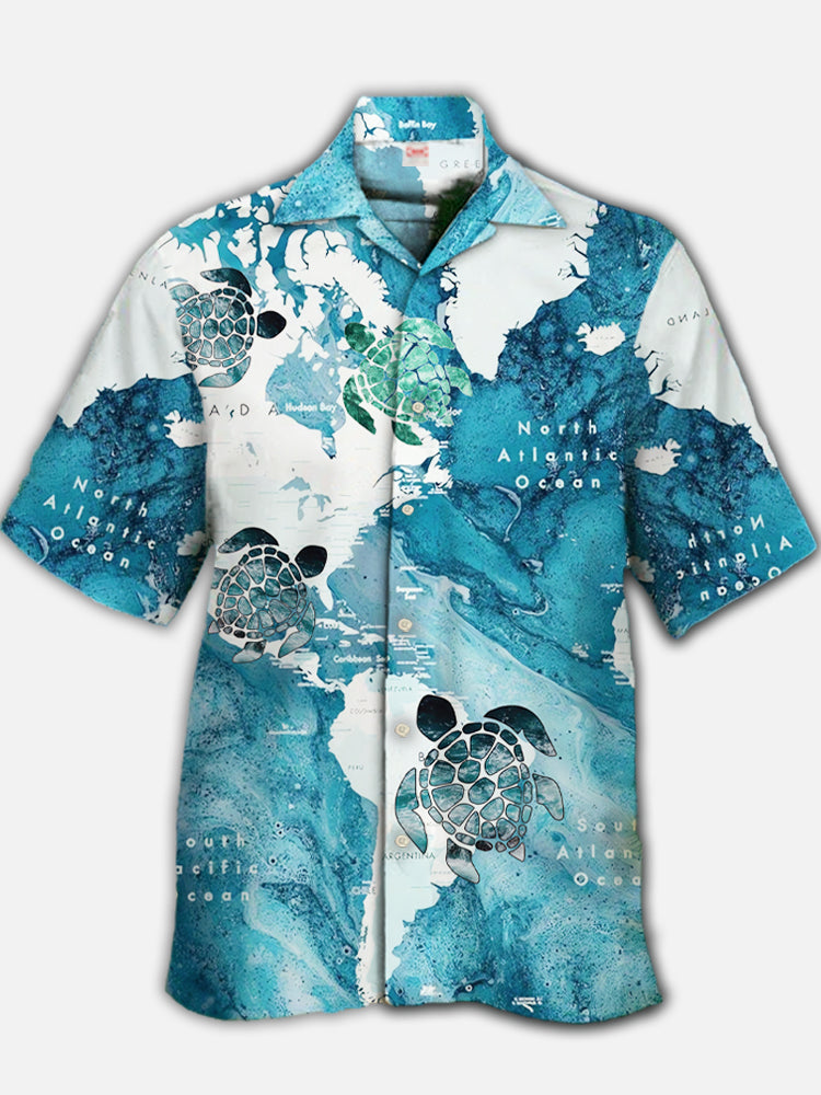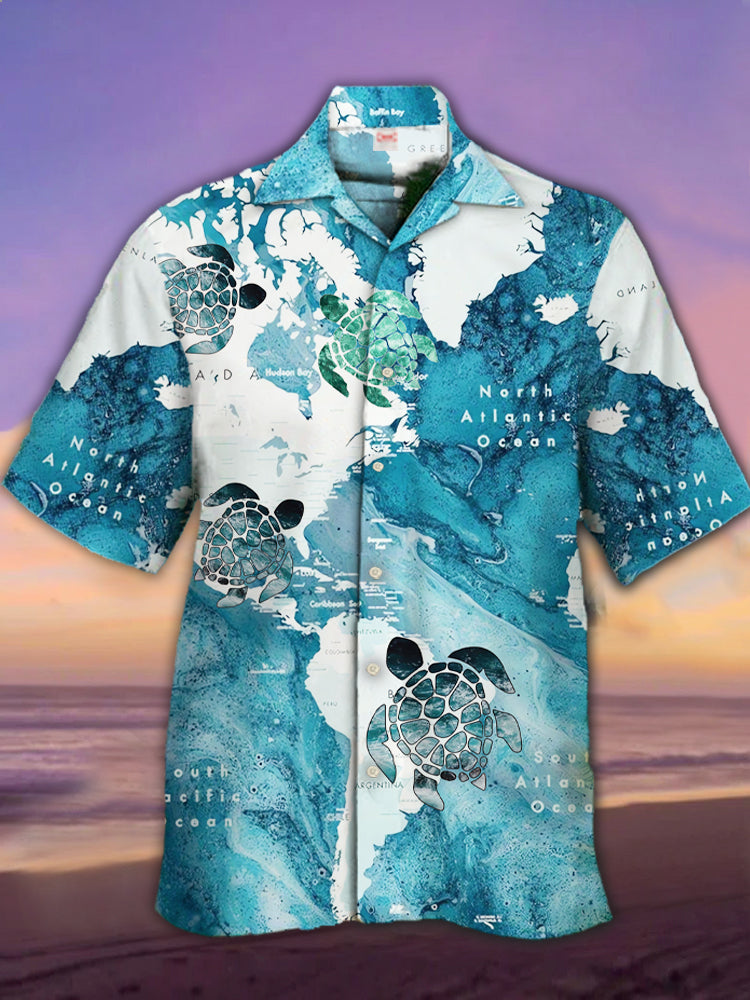 Eye-Catching Map And Sea Turtles Printing Beach Travel Cuban Collar Hawaiian Short Sleeve Shirt