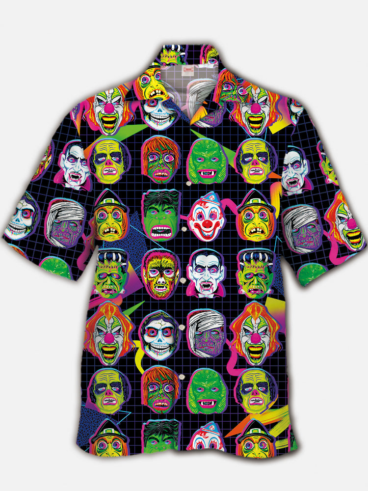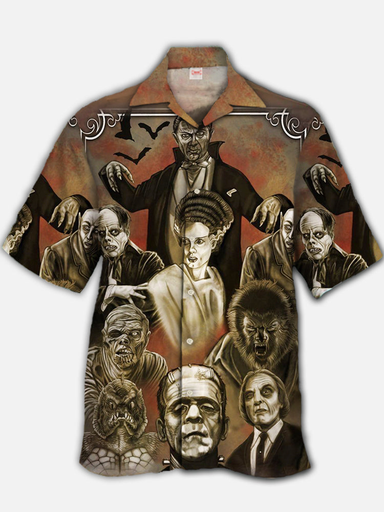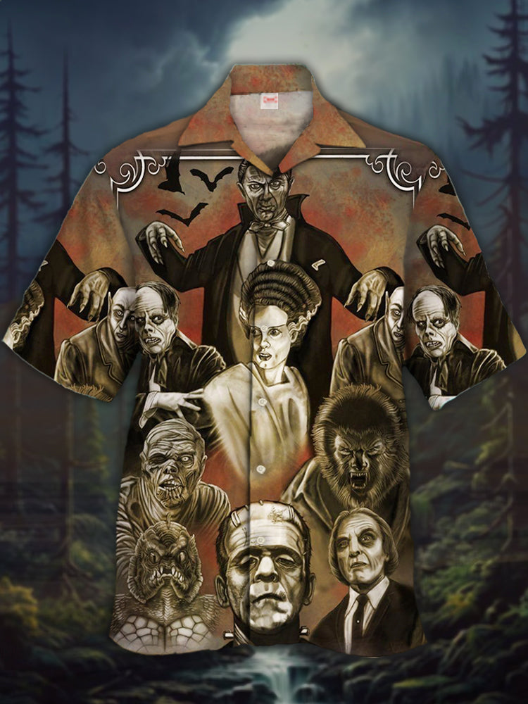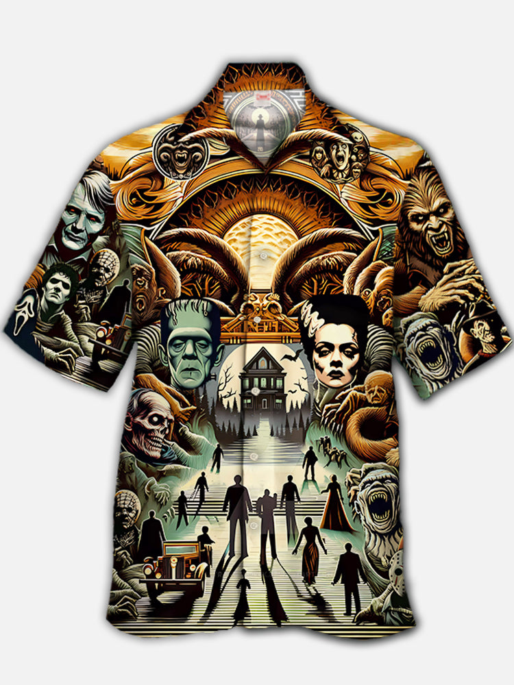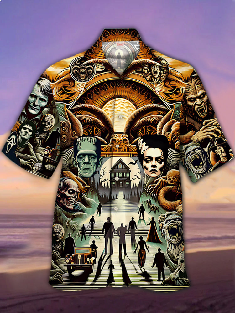 Eye-Catching Retro Classic Horror Characters Halloween Printing Cuban Collar Hawaiian Short Sleeve Shirt
