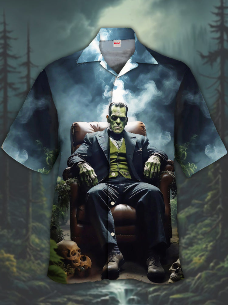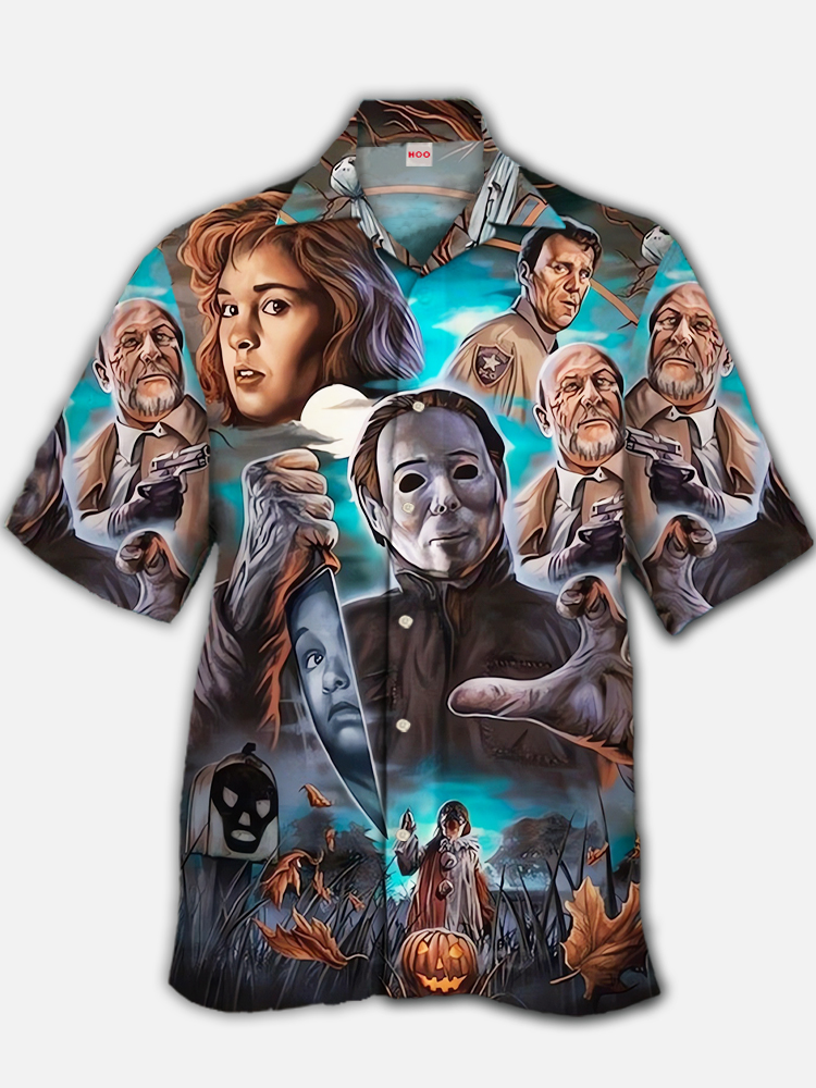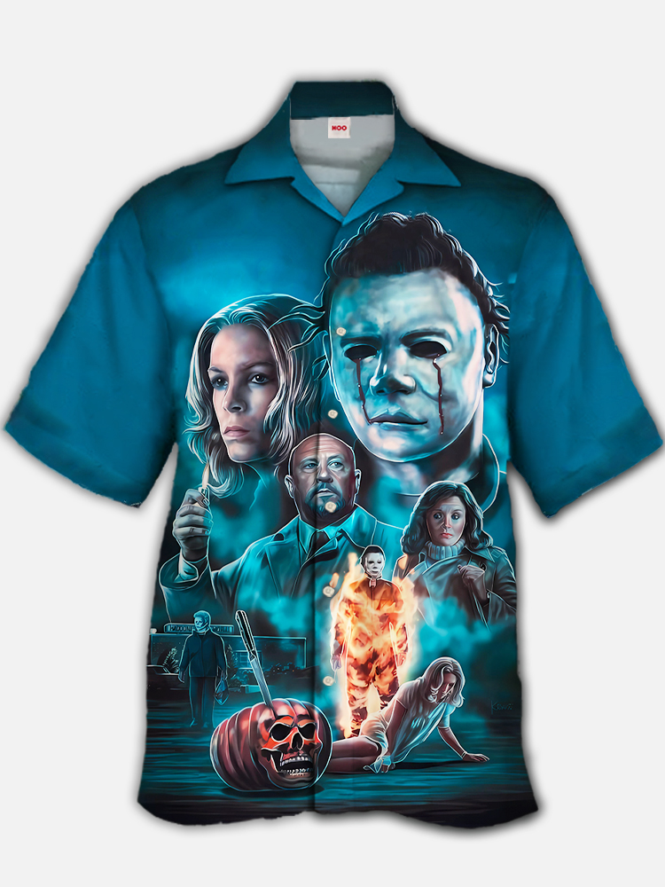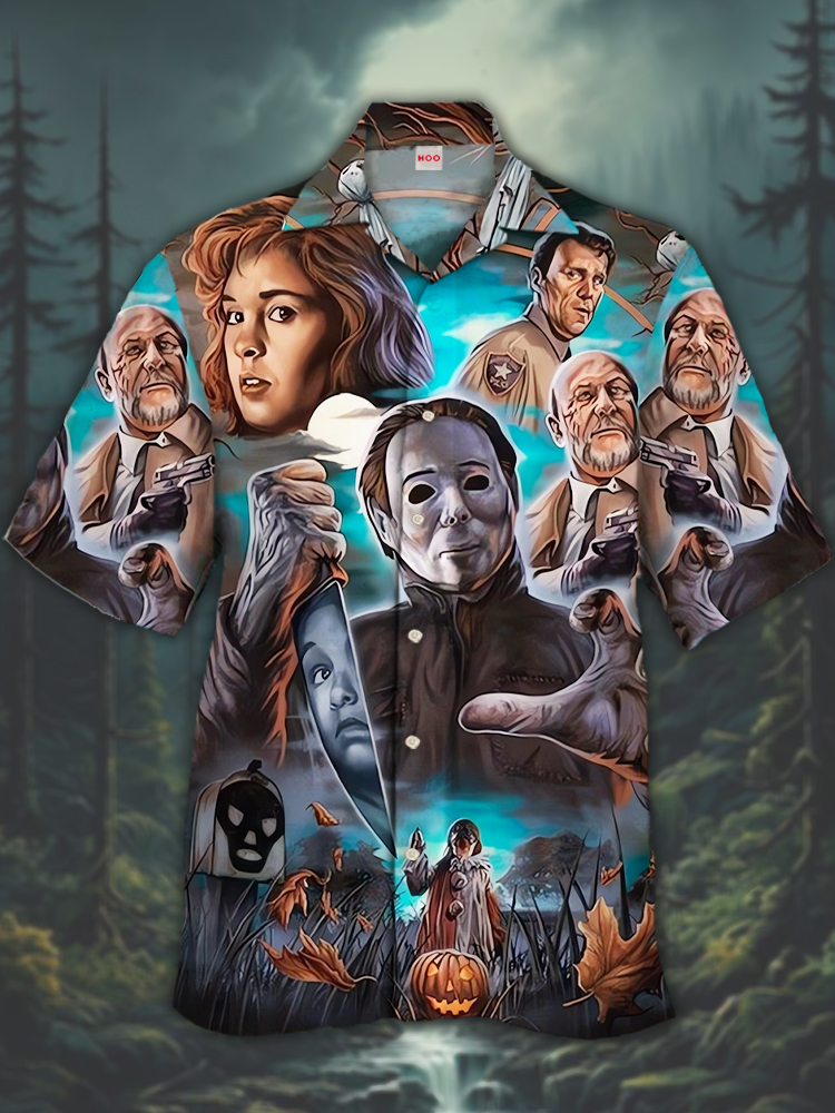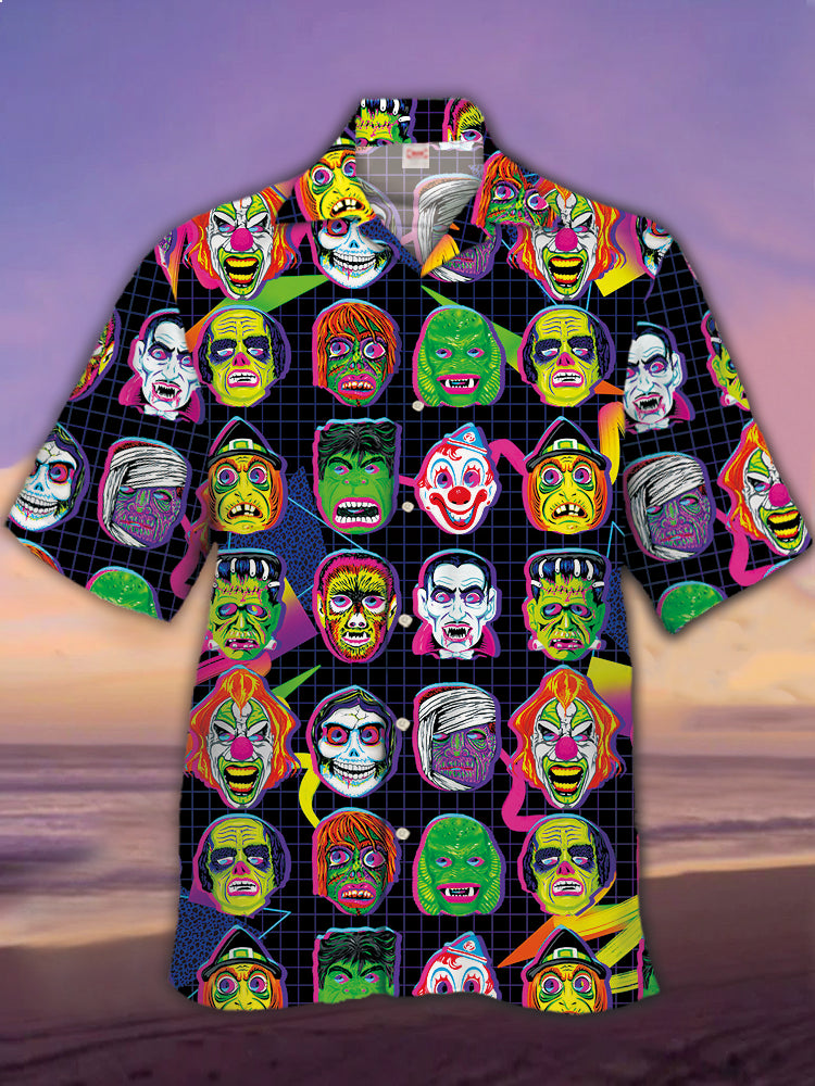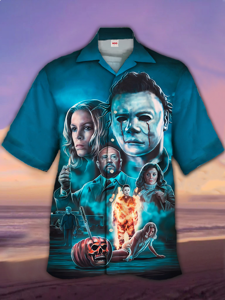 Eye-Catching Retro Classic Horror Characters Halloween Printing Cuban Collar Hawaiian Short Sleeve Shirt