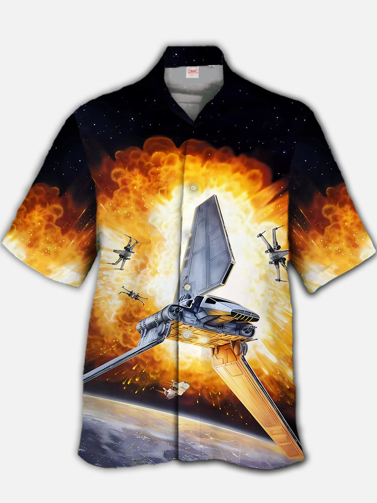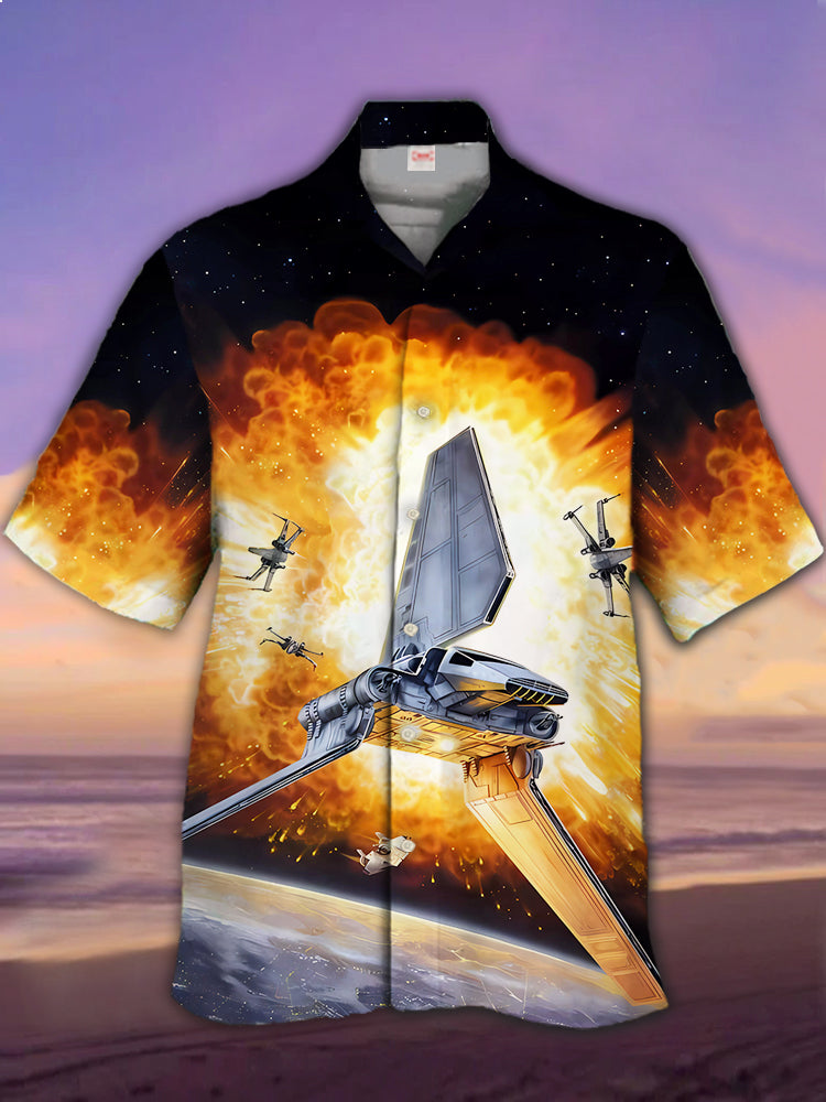 Eye-Catching Sci-Fi Flame Blasting Space And Spaceships Printing Cuban Collar Hawaiian Short Sleeve Shirt