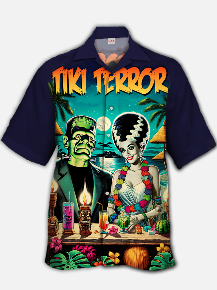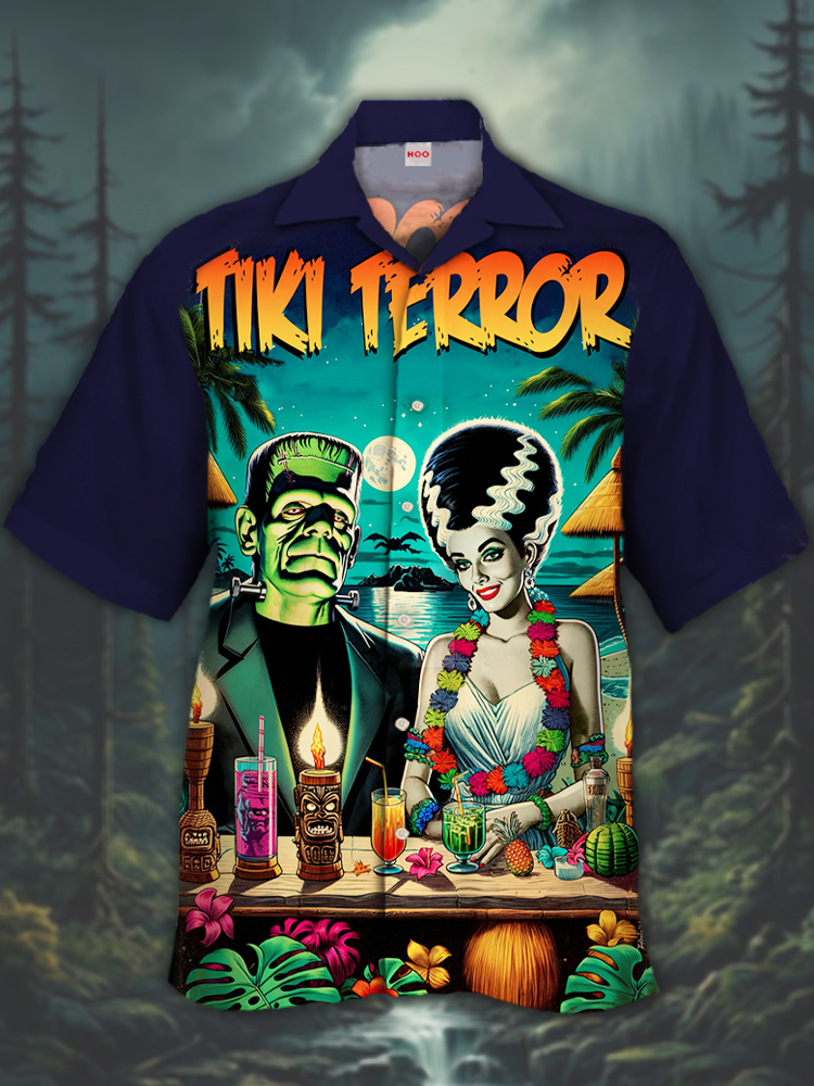 Eye-Catching Beach Tiki Bar And Classic Horror Characters Printing Cuban Collar Hawaiian Short Sleeve Shirt