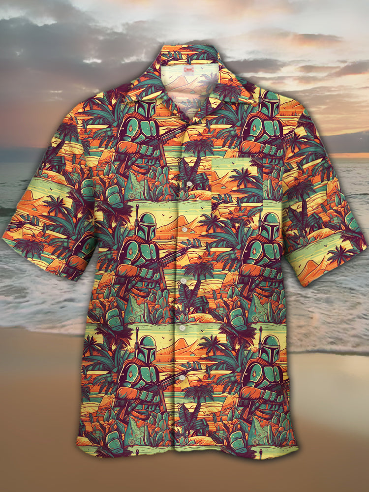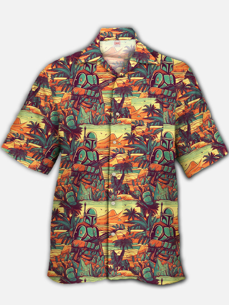 Eye-Catching Comic Style Sci-Fi Space War Desert And Samurai Printing Cuban Collar Hawaiian Short Sleeve Shirt