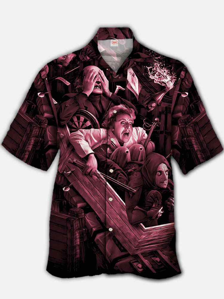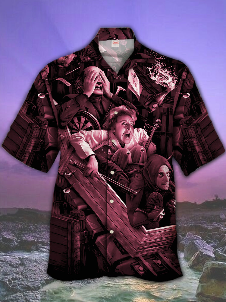 Eye-Catching Horror Movie Thriller Scooter And Horror Characters Printing Cuban Collar Hawaiian Short Sleeve Shirt