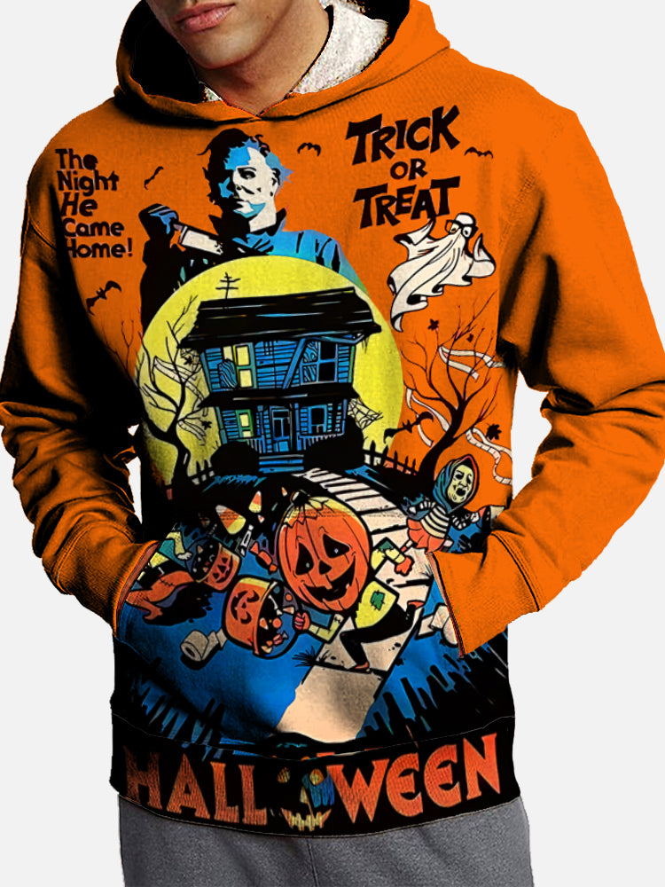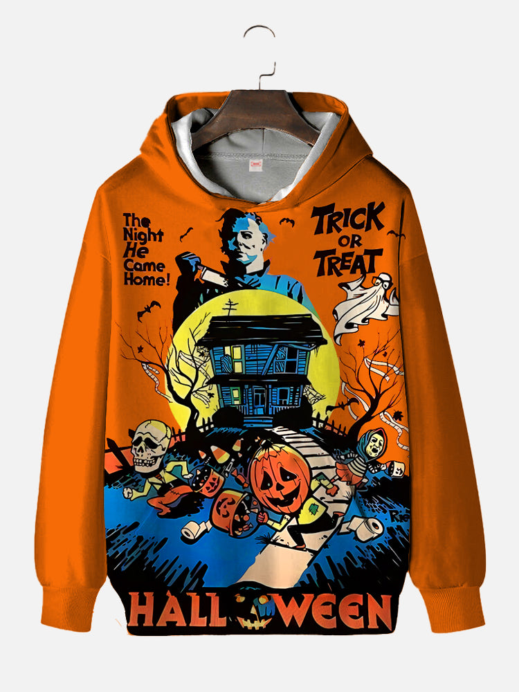 Orange Halloween Night Trick Or Treat Killer And Haunted House Printing Hooded Sweatshirt