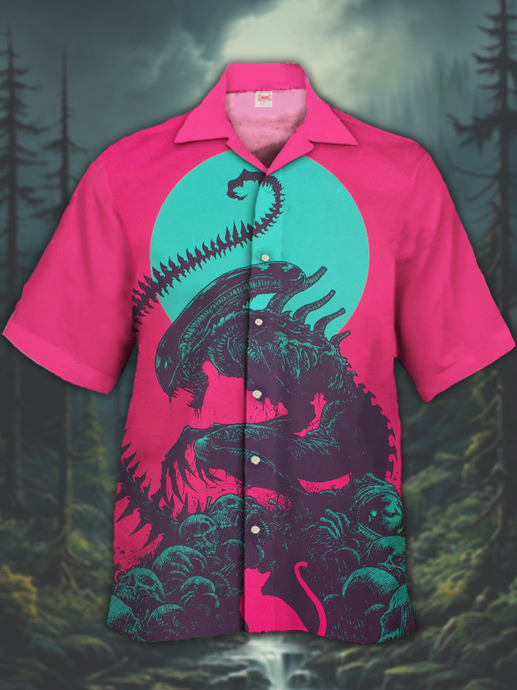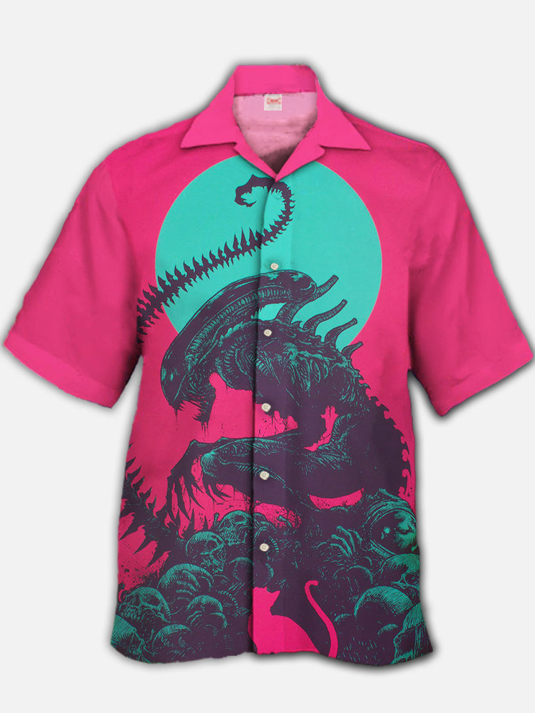 Eye-Catching Pink And Cyan Background Sci-Fi Alien World Metal Alien Creature Printing Cuban Collar Hawaiian Short Sleeve Shirt