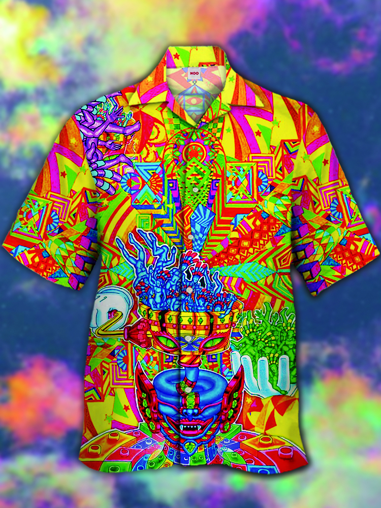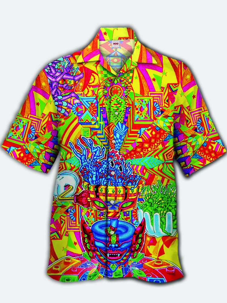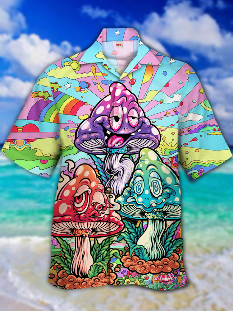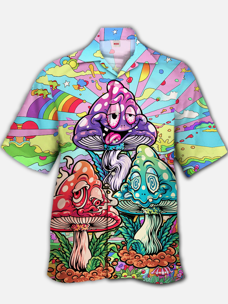 Eye-Catching Hippie Brightly Colored Psychedelic Mushrooms Printing Cuban Collar Hawaiian Short Sleeve Shirt