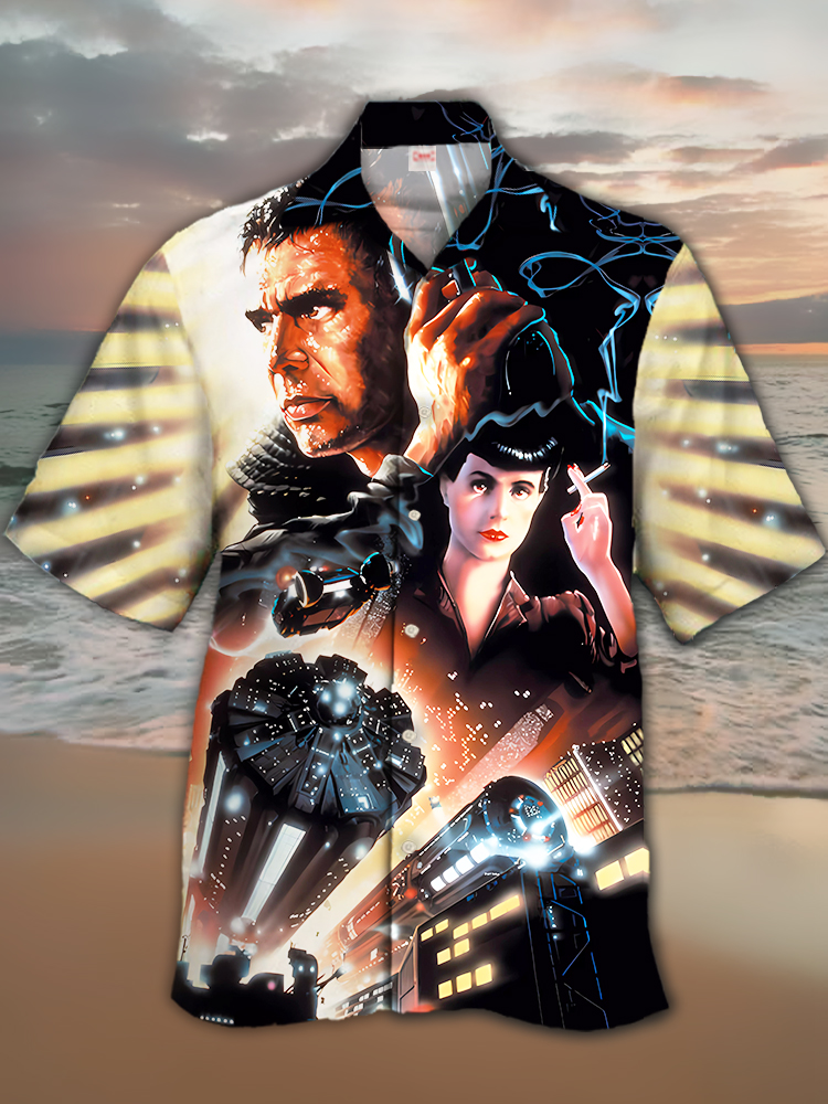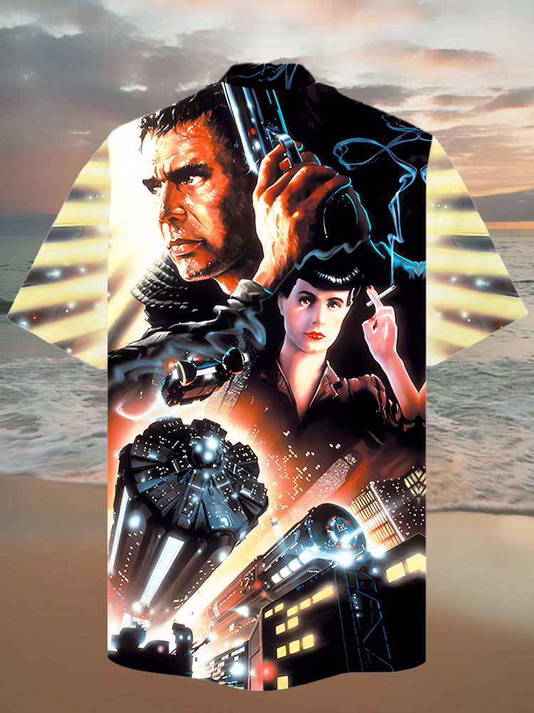 Eye-Catching Sci-Fi Future City Scenes Skyscrapers And Characters Pattern Printing Cuban Collar Hawaiian Short Sleeve Shirt