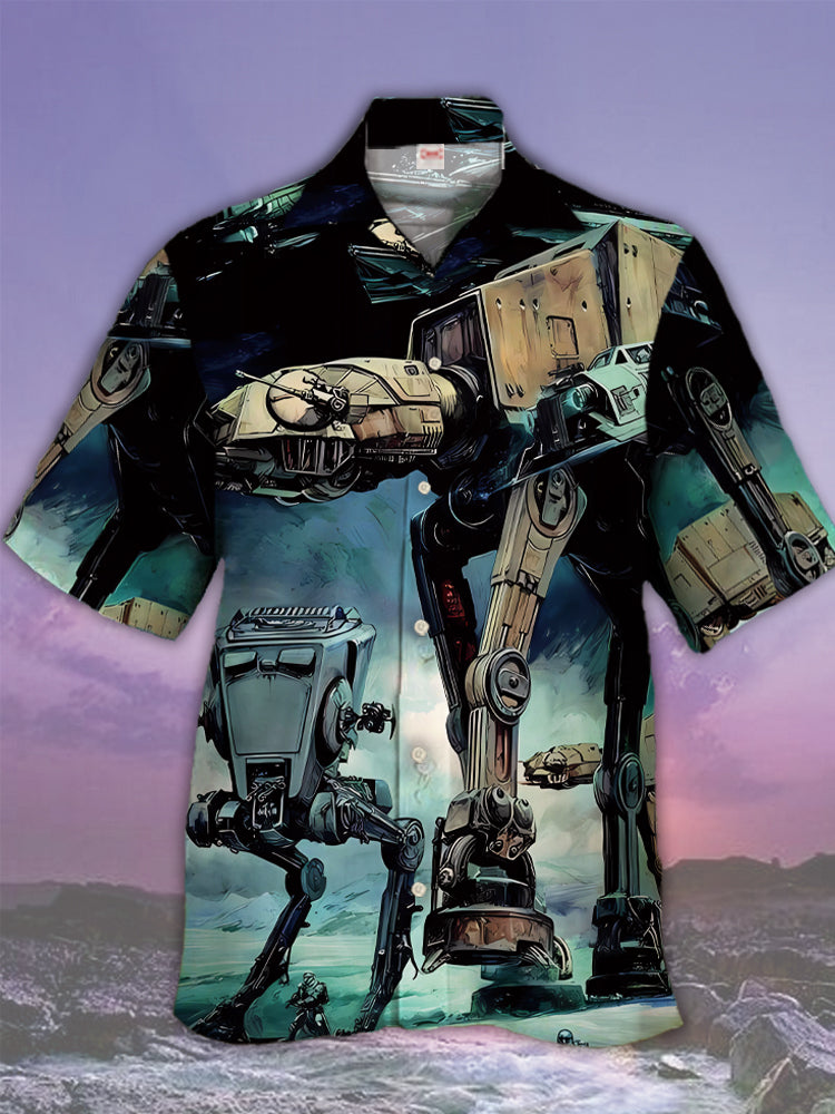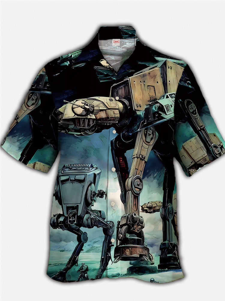 Eye-Catching Sci-Fi Ancient Armed Walker And Armed Robot Printing Cuban Collar Hawaiian Short Sleeve Shirt