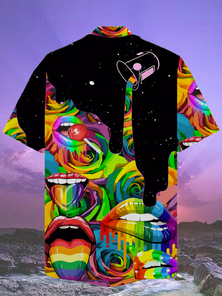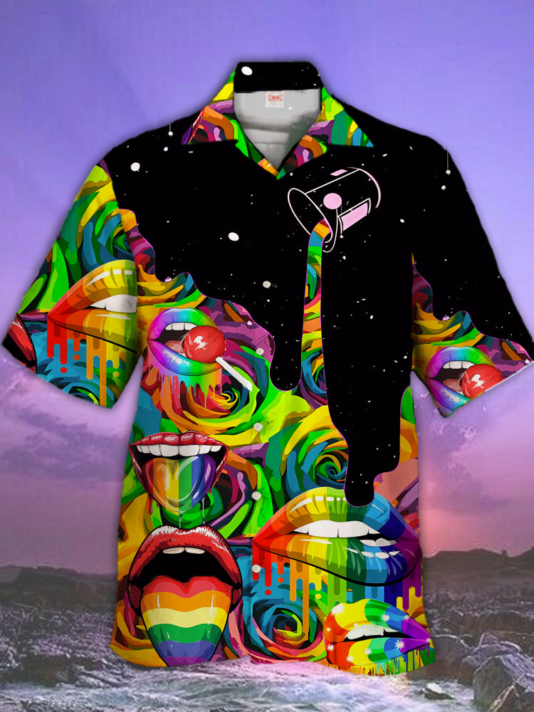 Eye-Catching Psychedelic Rainbow Lips Printing Cuban Collar Hawaiian Short Sleeve Shirt