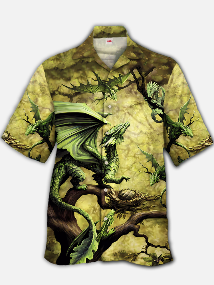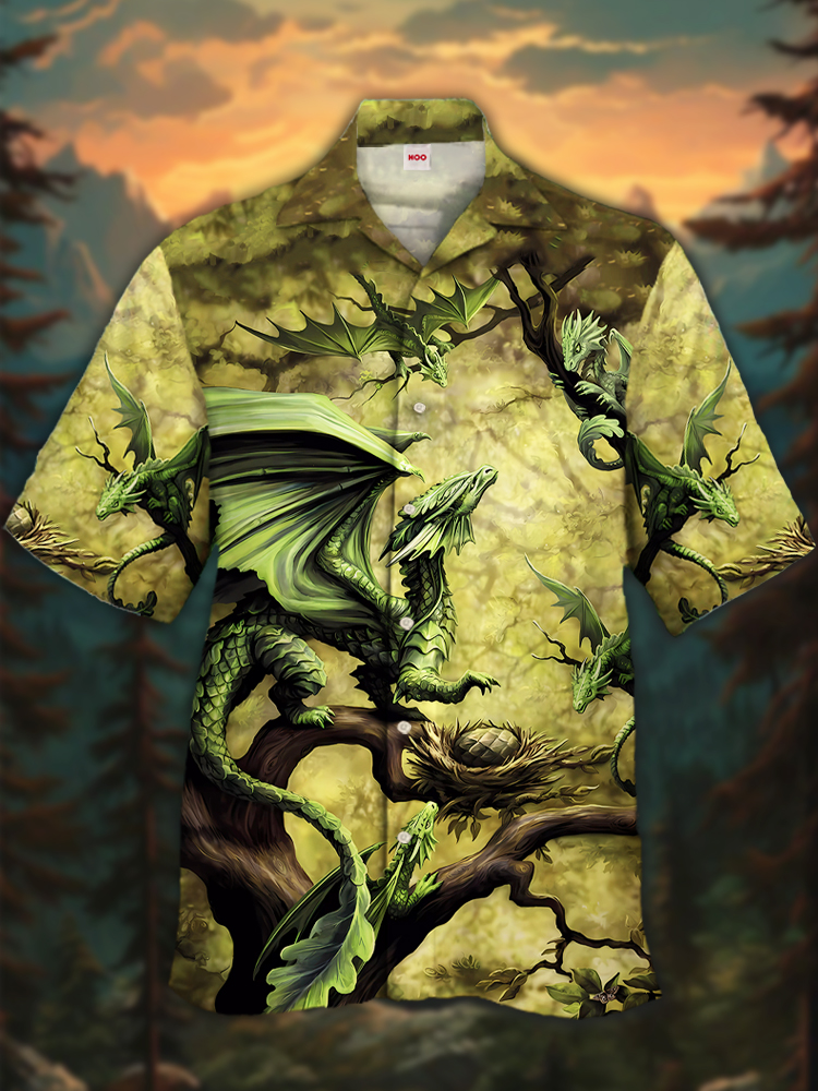 Eye-Catching Green Awesome Dragon In The Forest Printing Cuban Collar Hawaiian Short Sleeve Shirt