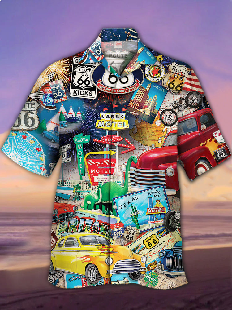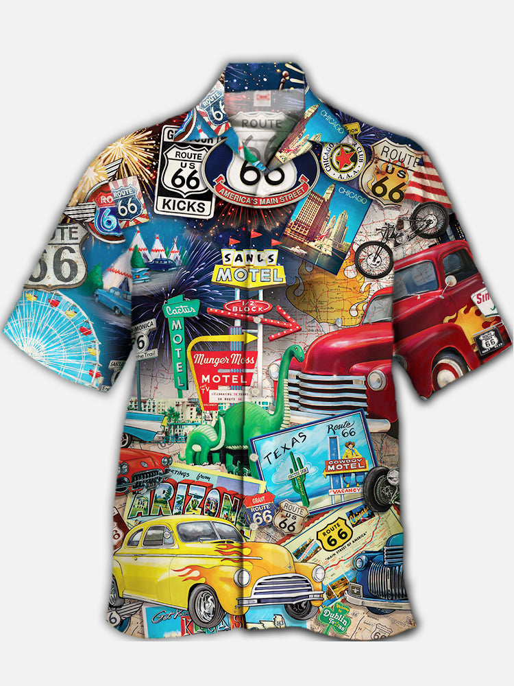Eye-Catching Route 66 Mother Road And Vintage Cars Printing Cuban Collar Hawaiian Short Sleeve Shirt