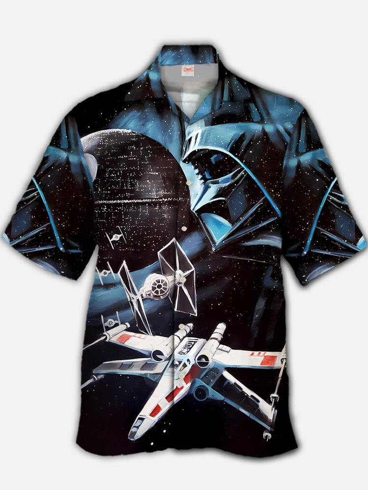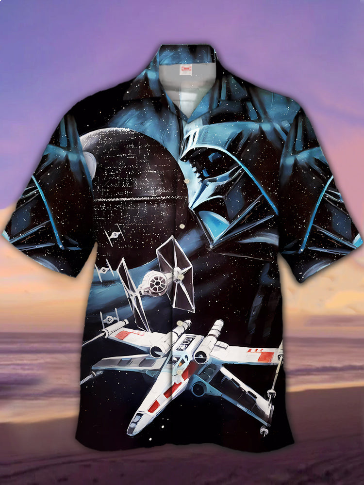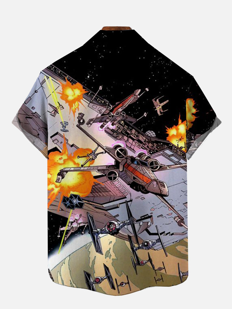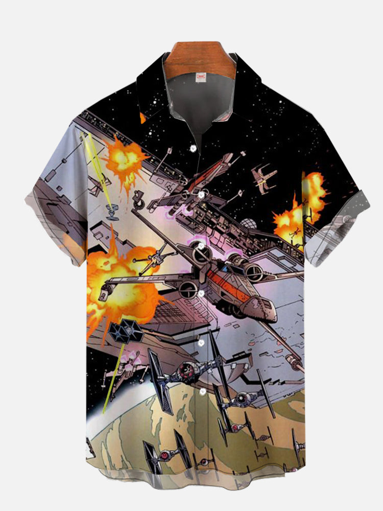 Eye-Catching Sci-Fi Space War Samurai Planet And Aircraft Printing Cuban Collar Hawaiian Short Sleeve Shirt