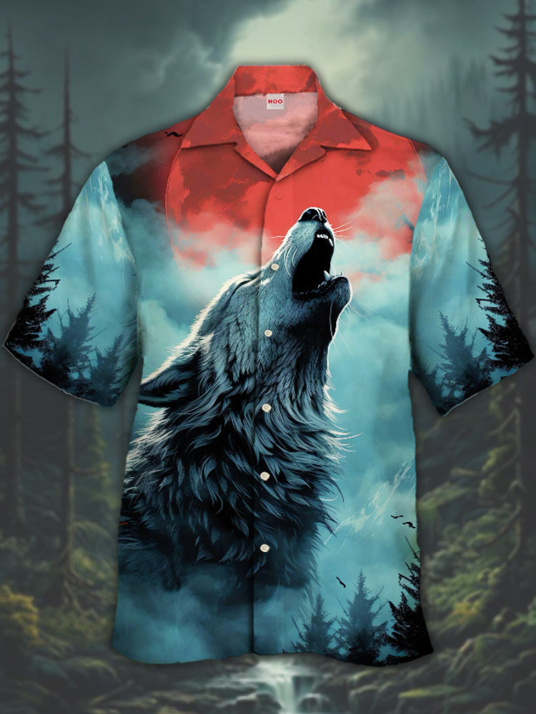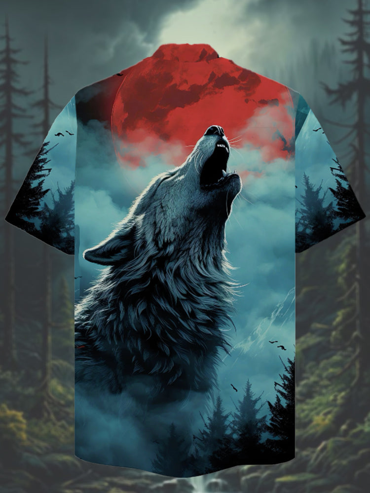 Eye-Catching Stunning Style Blood Moon And Howling Wolf Printing Cuban Collar Hawaiian Short Sleeve Shirt
