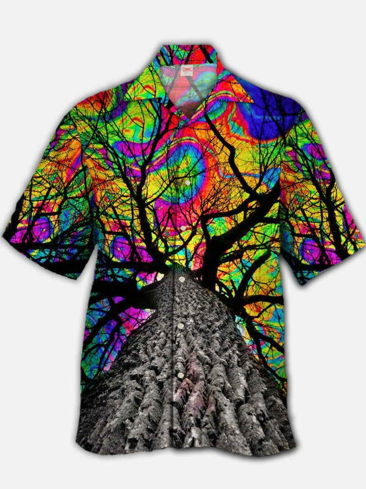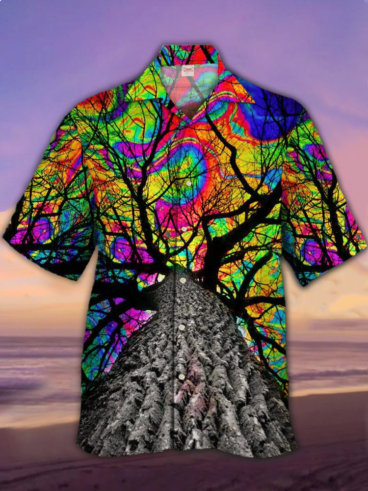 Eye-Catching Psychedelic Rainbow Magic Tree Printing Cuban Collar Hawaiian Short Sleeve Shirt
