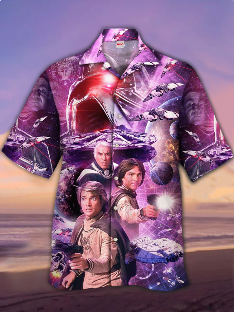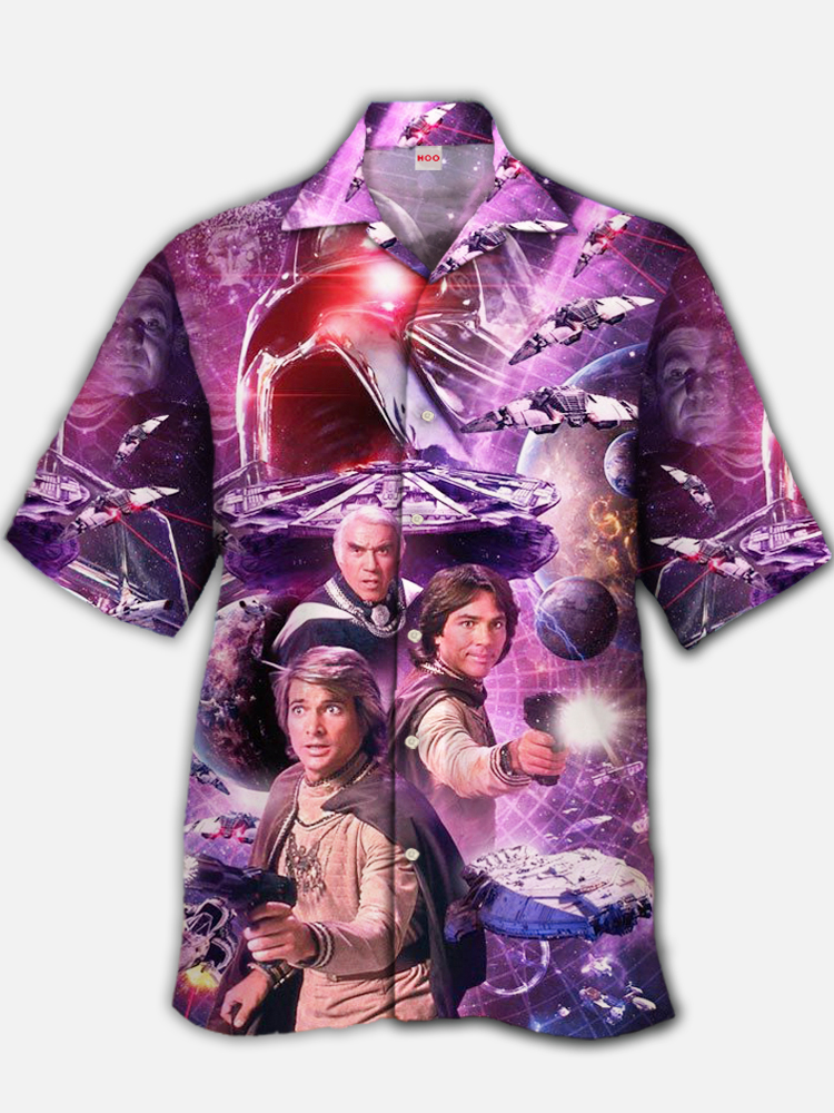 Eye-Catching Sci-Fi Space War Purple Gorgeous Space And Characters Printing Cuban Collar Hawaiian Short Sleeve Shirt
