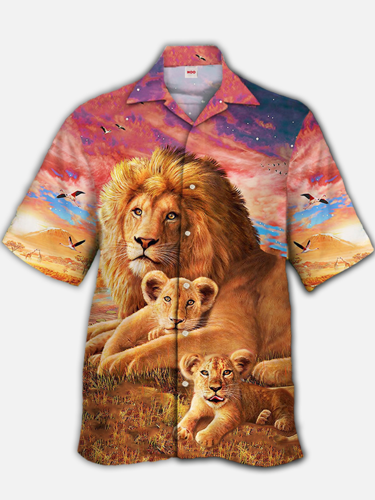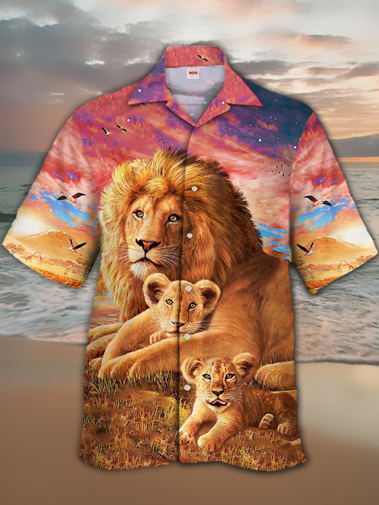 Eye-Catching Powerful Lion Father And Sons Printing Cuban Collar Hawaiian Short Sleeve Shirt