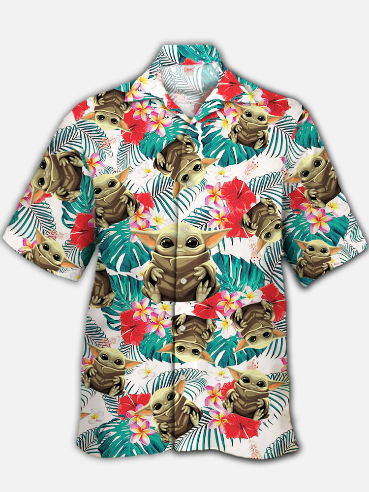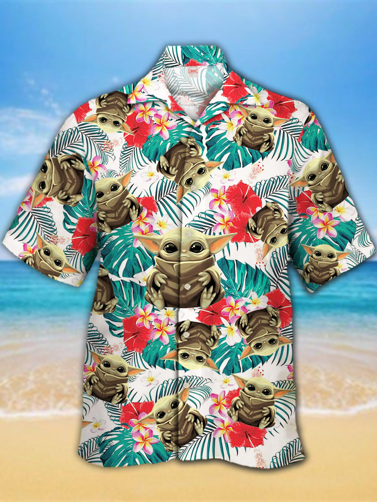 Eye-Catching Exotic Style Cartoon Sci-Fi Space Warrior And Leaves Printing Cuban Collar Hawaiian Short Sleeve Shirt