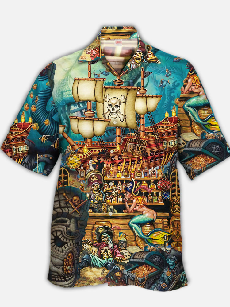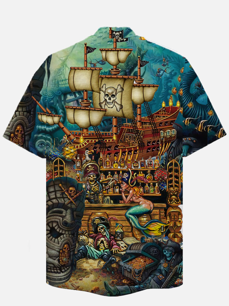 Eye-Catching Vintage Map Print Skull Pirate Treasure Printing Cuban Collar Hawaiian Short Sleeve Shirt