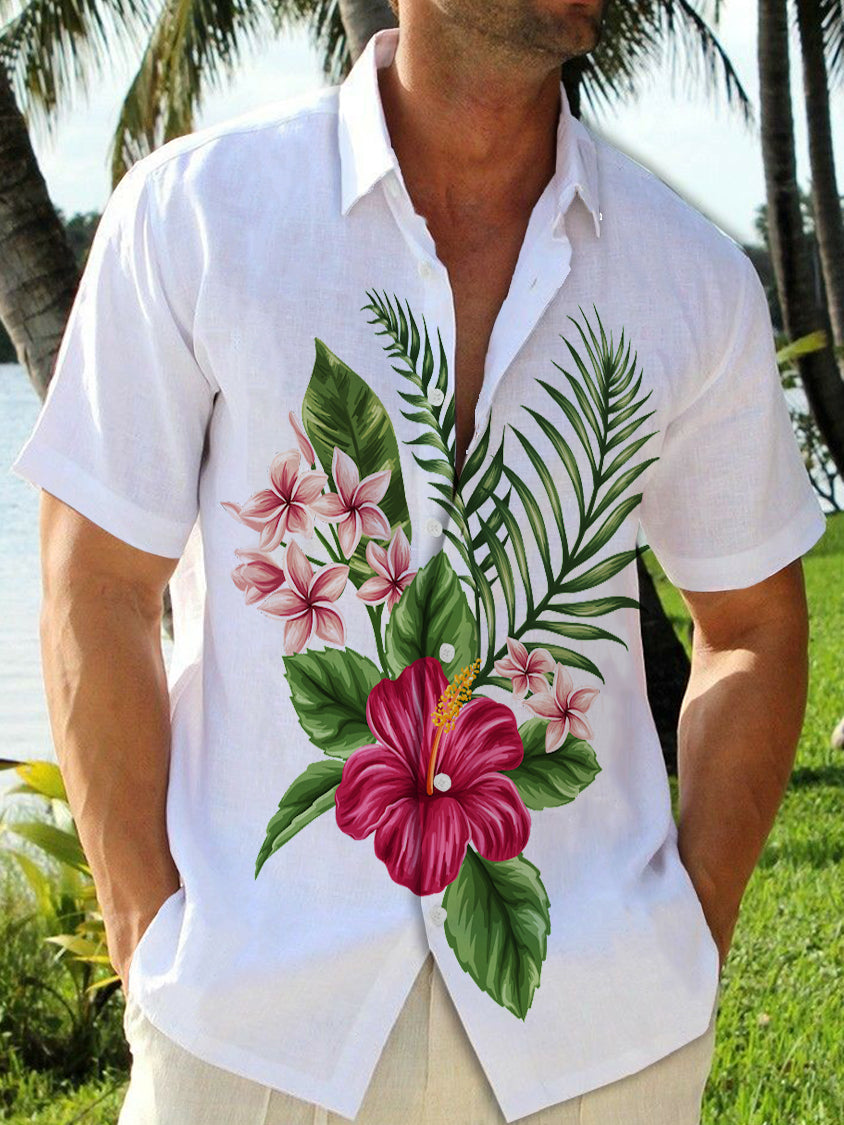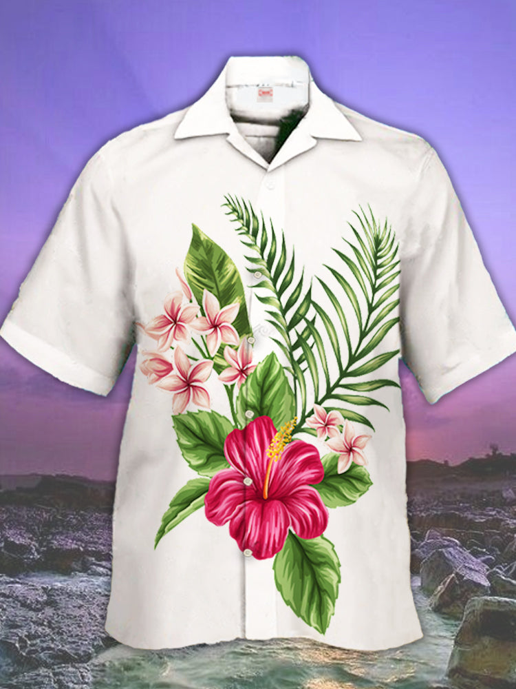 Eye-Catching Two-Color Plant Elements Hibiscus Flower And Leaf Printing Cuban Collar Hawaiian Short Sleeve Shirt