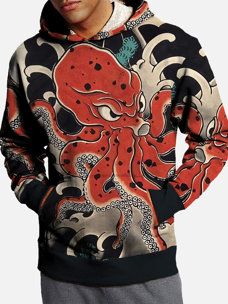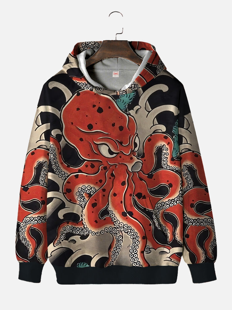 Colorful Ukiyo-e Mythical Funny Octopus Printing Hooded Sweatshirt