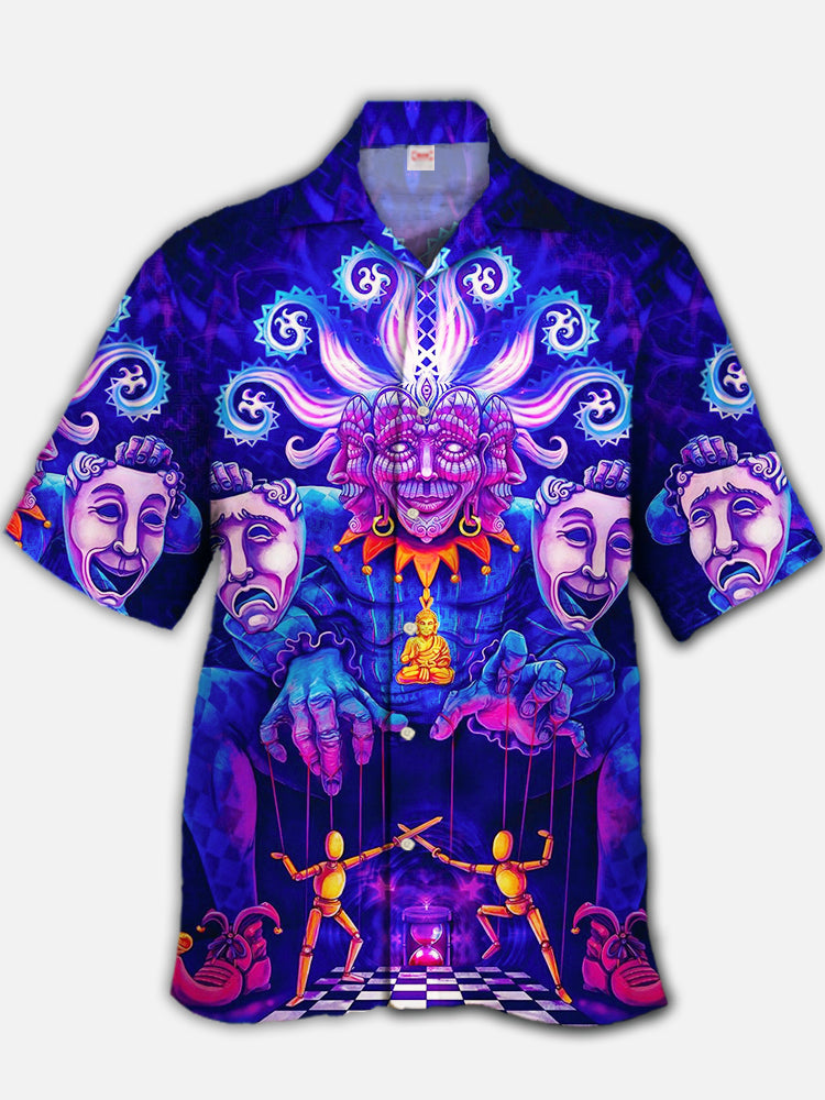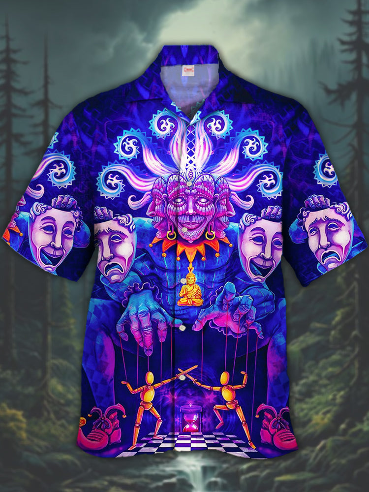 Eye-Catching Neon Psychedelic Scary Clown Puppets Printing Cuban Collar Hawaiian Short Sleeve Shirt
