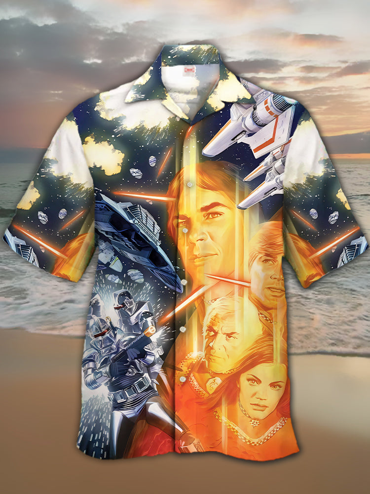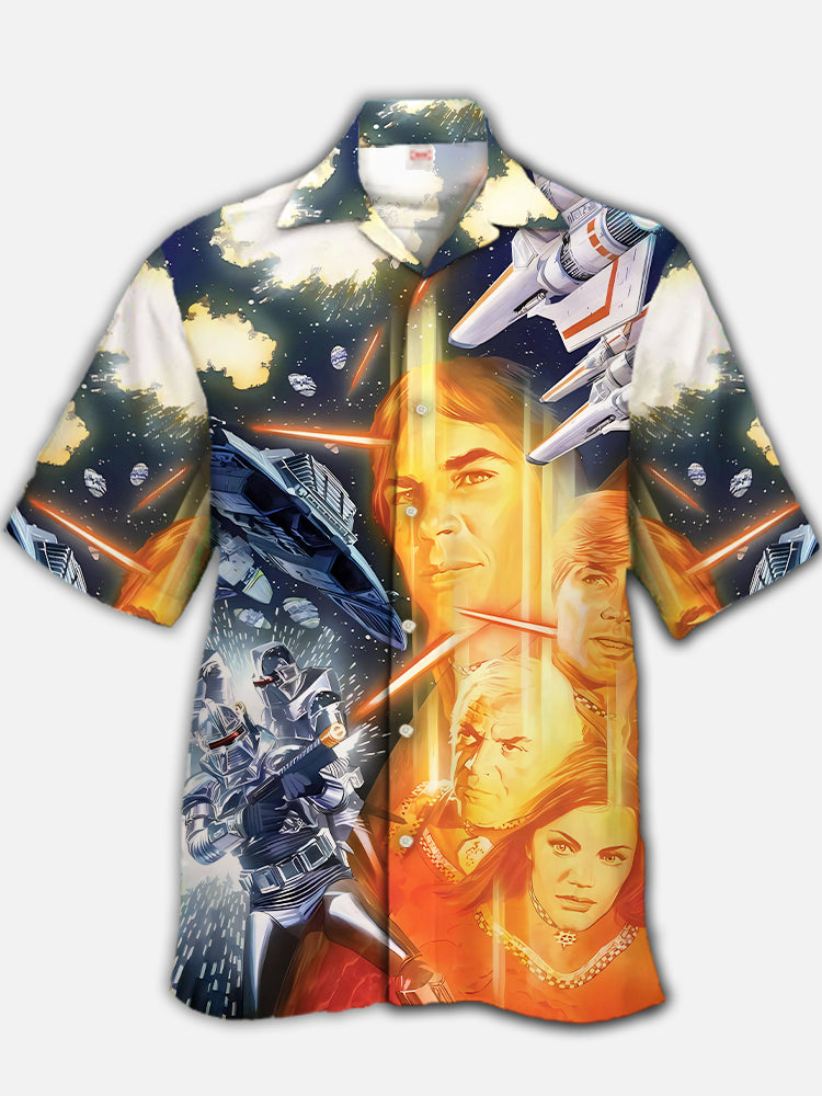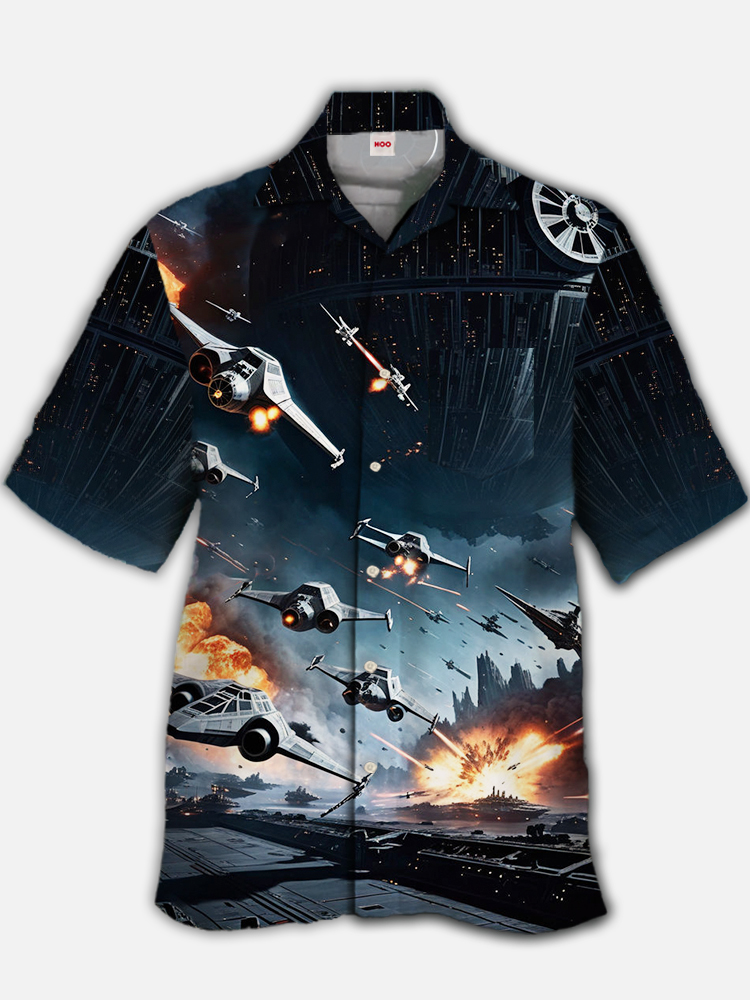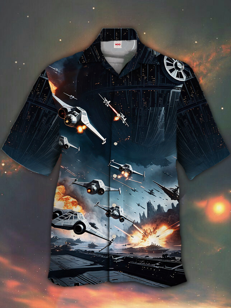 Eye-Catching Classic Shocking Sci-Fi Space War Printing Cuban Collar Hawaiian Short Sleeve Shirt
