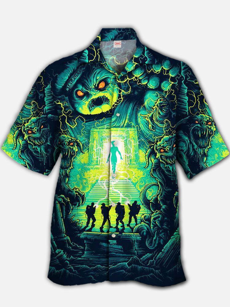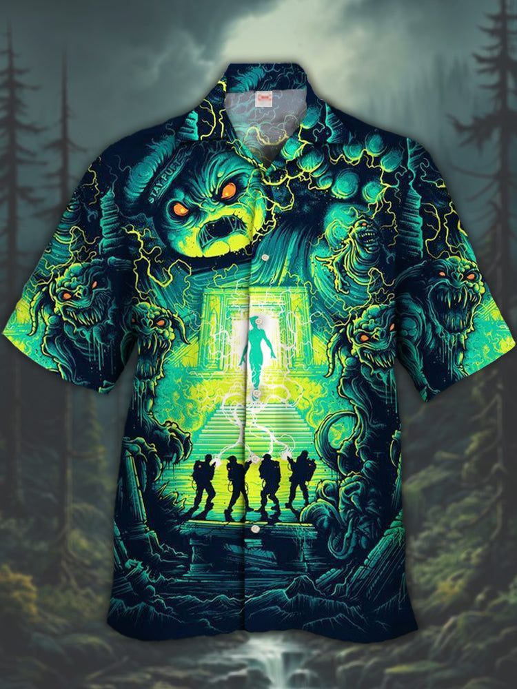 Eye-Catching Psychedelic Sci-Fi Crazy Adventure Team And Ferocious Ghosts Printing Cuban Collar Hawaiian Short Sleeve Shirt