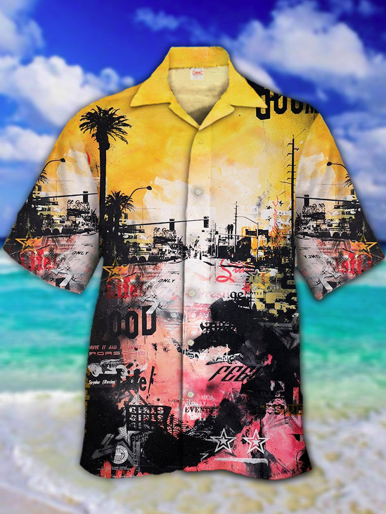 Eye-Catching Graffiti Pattern Pop Art Orange And Black Retro Architecture Silhouette Printing Cuban Collar Hawaiian Short Sleeve Shirt