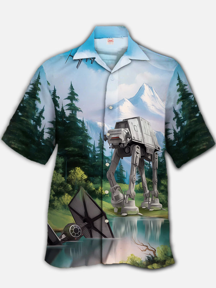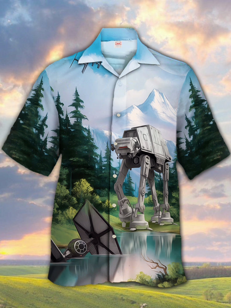 Eye-Catching Sci-Fi Space War Armed Walker And Fallen Fighter Jet In The Forest Printing Cuban Collar Hawaiian Short Sleeve Shirt