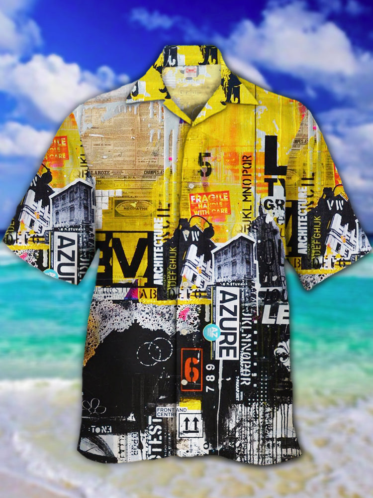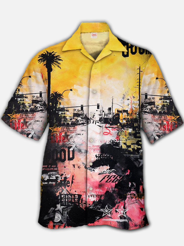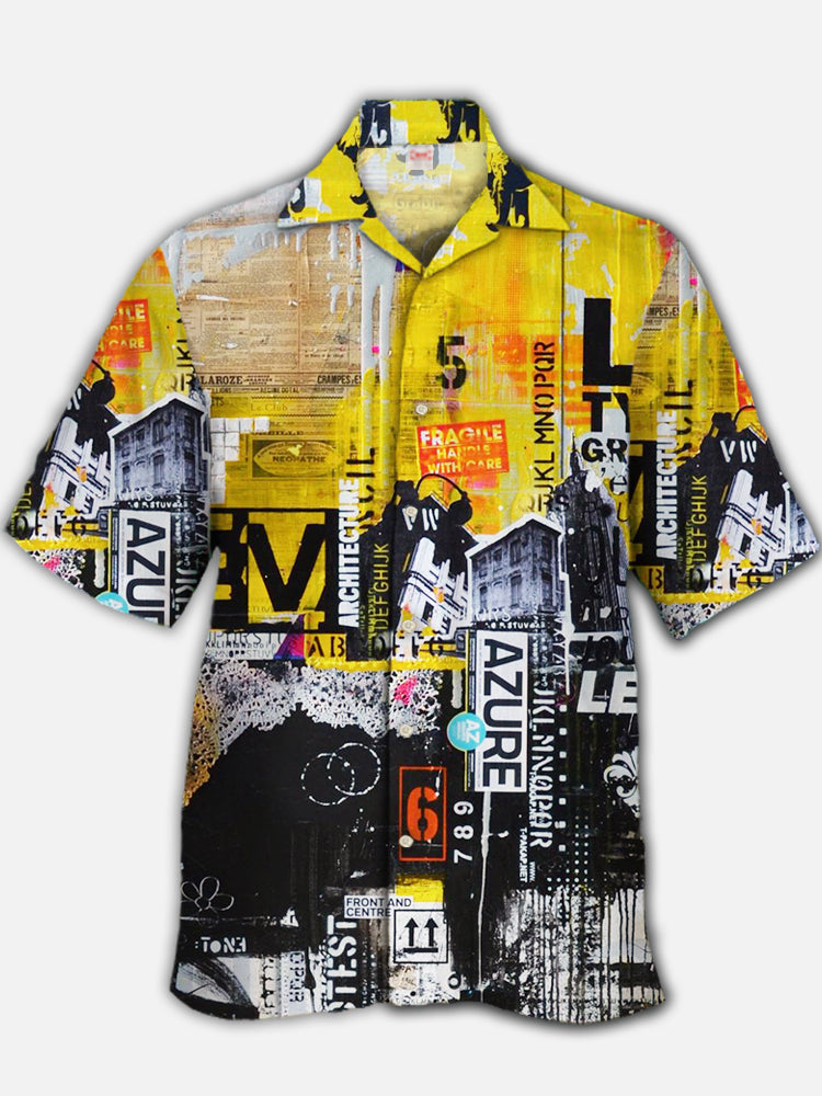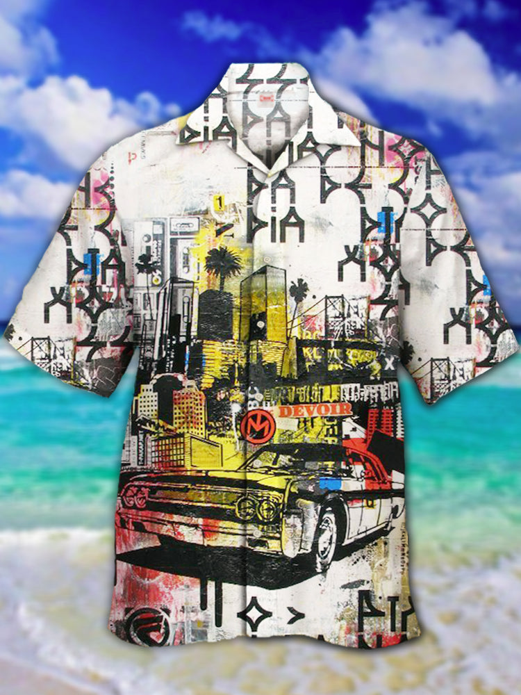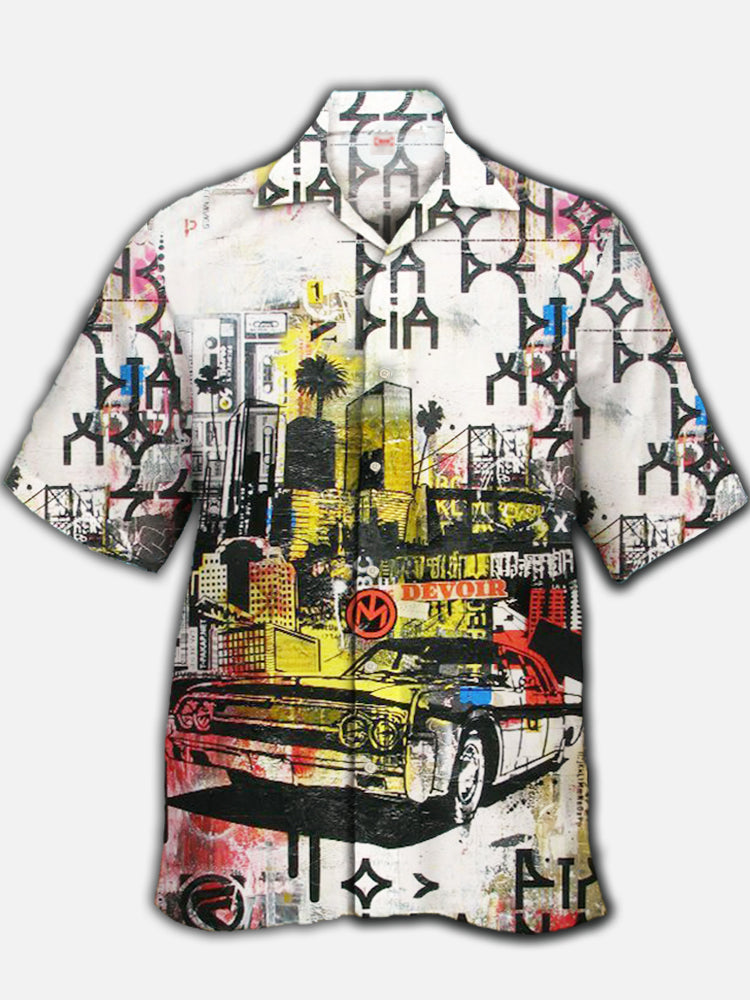 Eye-Catching Abstract Pop Art Urban Graffiti Retro Car Silhouette Printing Cuban Collar Hawaiian Short Sleeve Shirt