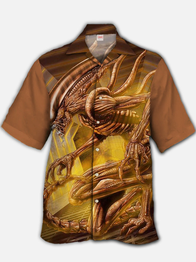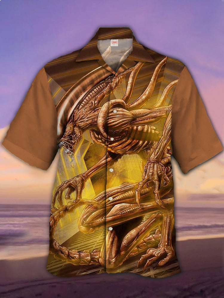 Eye-Catching Brown And Gold Background Sci-Fi Alien World Metal Alien Creature Printing Cuban Collar Hawaiian Short Sleeve Shirt