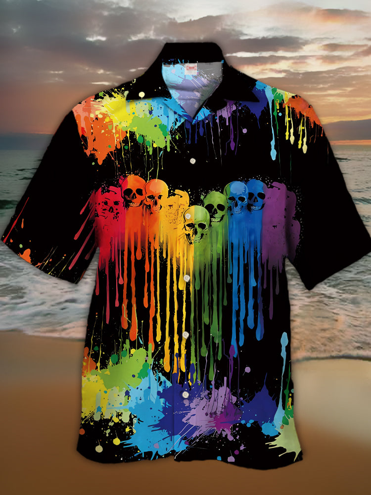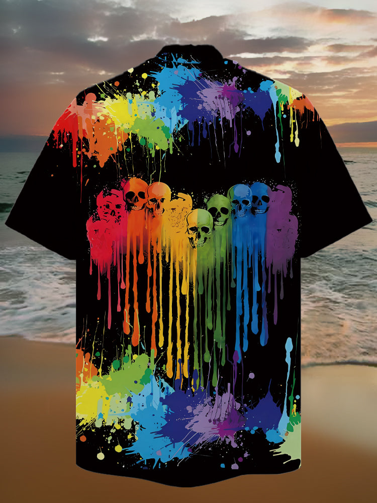 Eye-Catching Rainbow Painting Paint Splatter Sugar Skull Printing Cuban Collar Hawaiian Short Sleeve Shirt