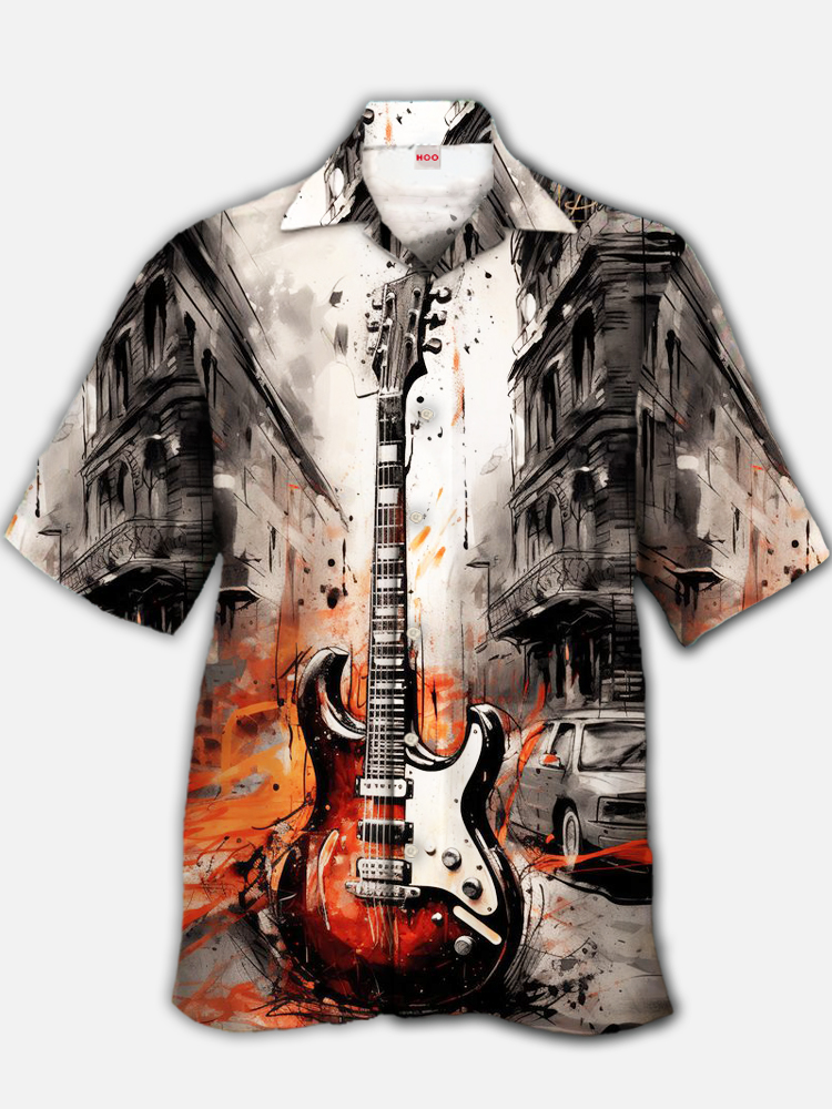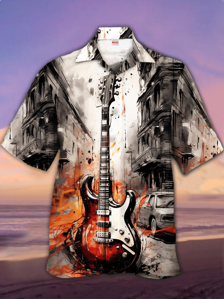 Eye-Catching Fire Electric Guitar Music Elements And Street Scenes Printing Cuban Collar Hawaiian Short Sleeve Shirt