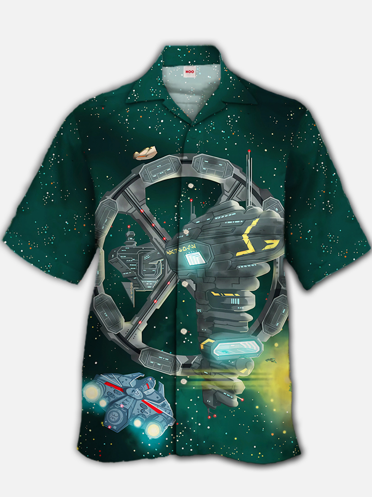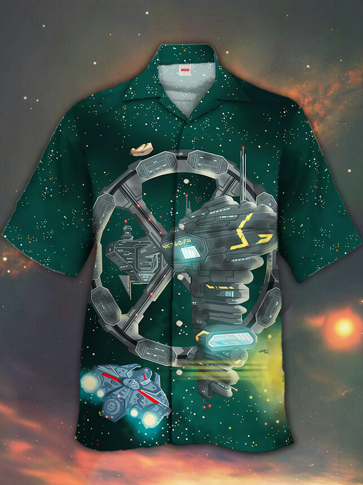 Eye-Catching Green Outer Space Sci-Fi Space Station And Spaceship Printing Cuban Collar Hawaiian Short Sleeve Shirt