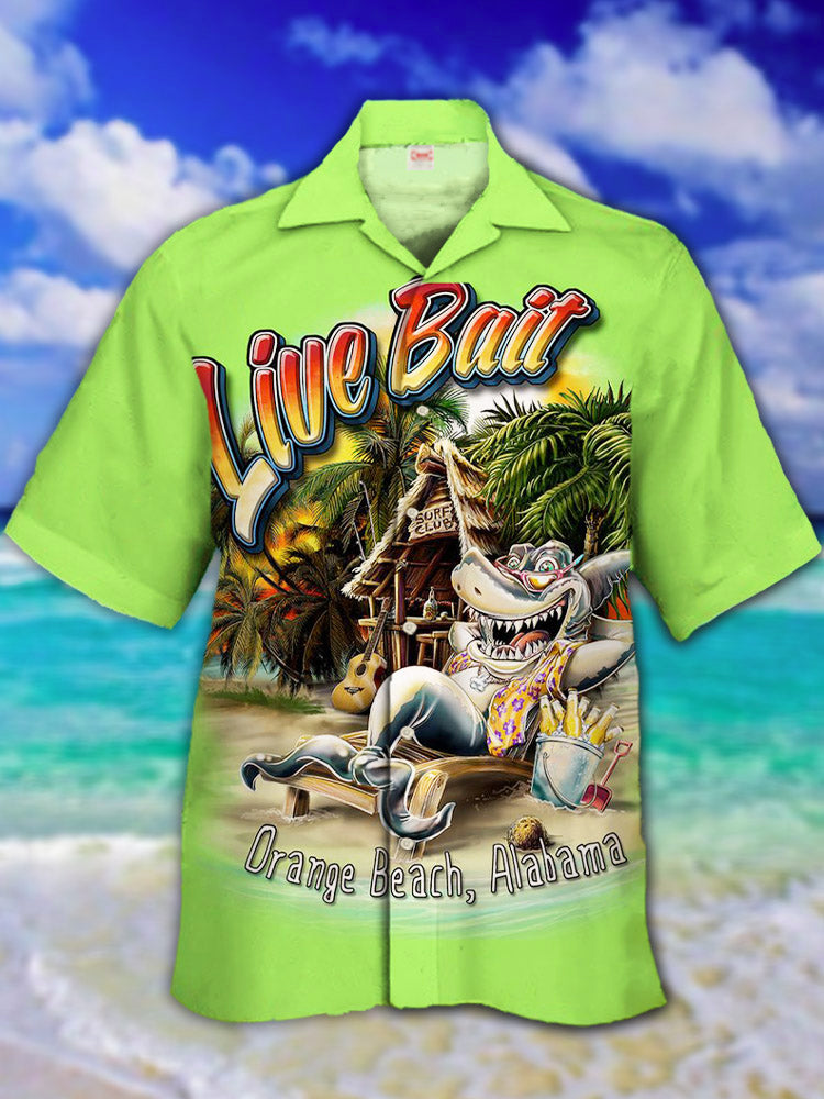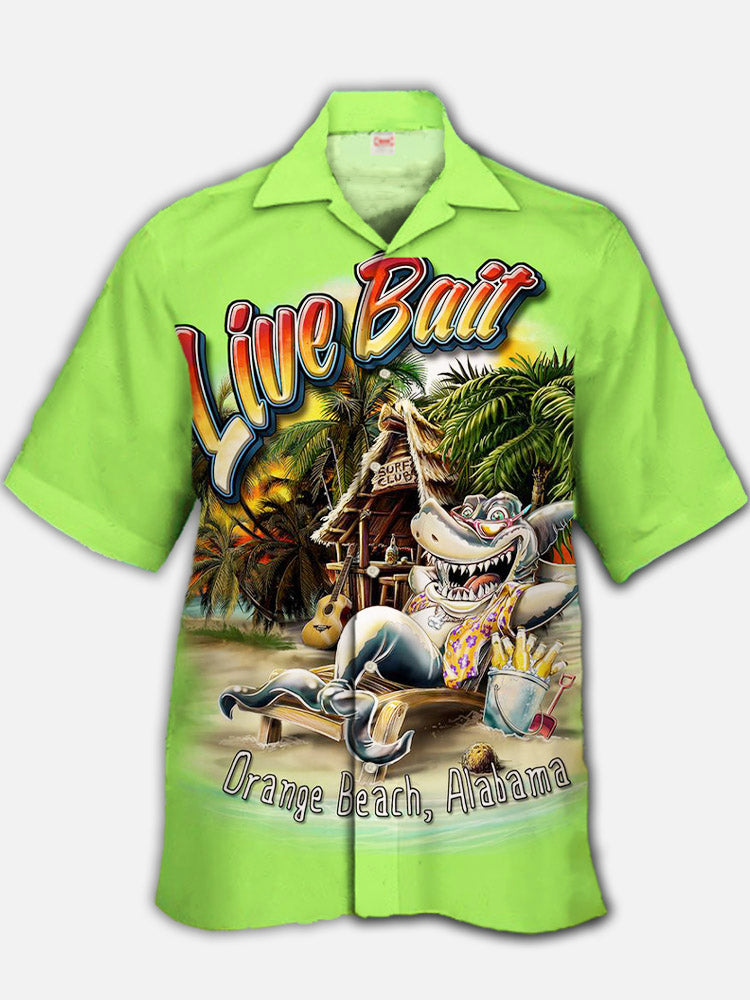 Eye-Catching Green Beach Bar And Shark Sunbathing Printing Cuban Collar Hawaiian Short Sleeve Shirt