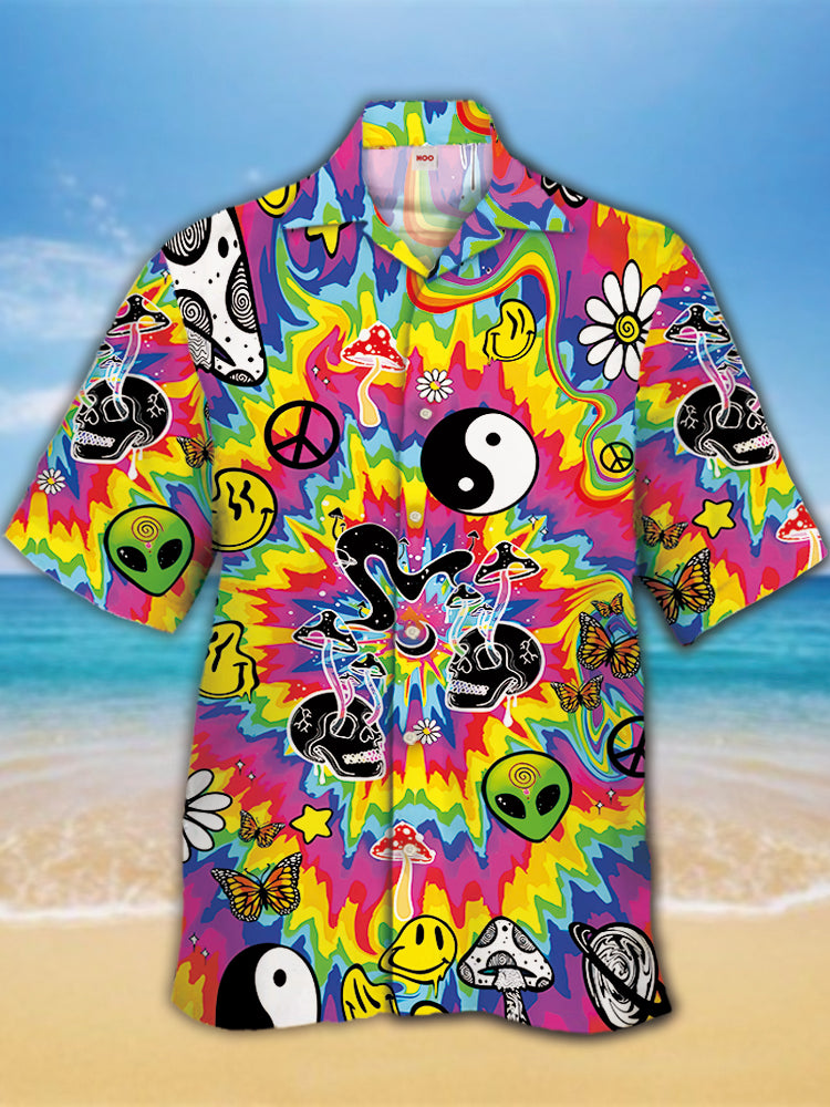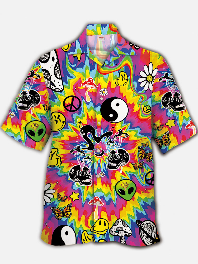Eye-Catching Psychedelic Hippie Rainbow Ink Spill Background Yin Yang Symbol Printing Cuban Collar Hawaiian Short Sleeve Shirt