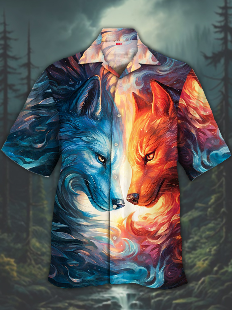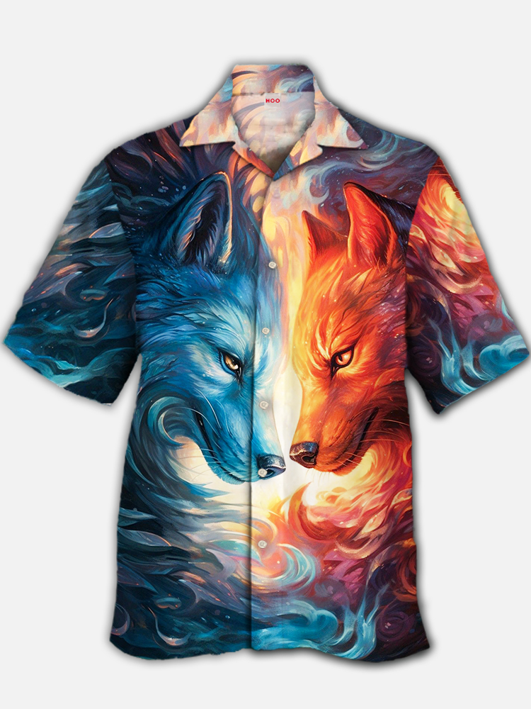 Eye-Catching Colorful Cool Ice Wolf And Fire Wolf Printing Cuban Collar Hawaiian Short Sleeve Shirt