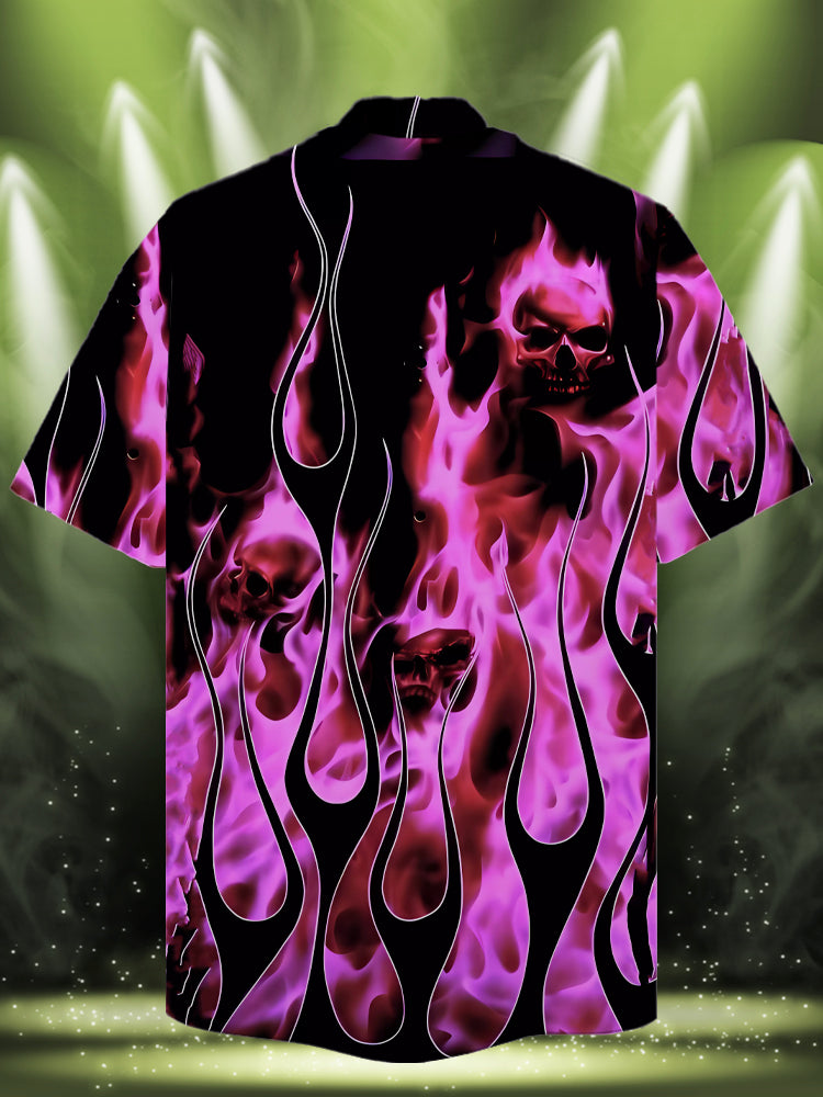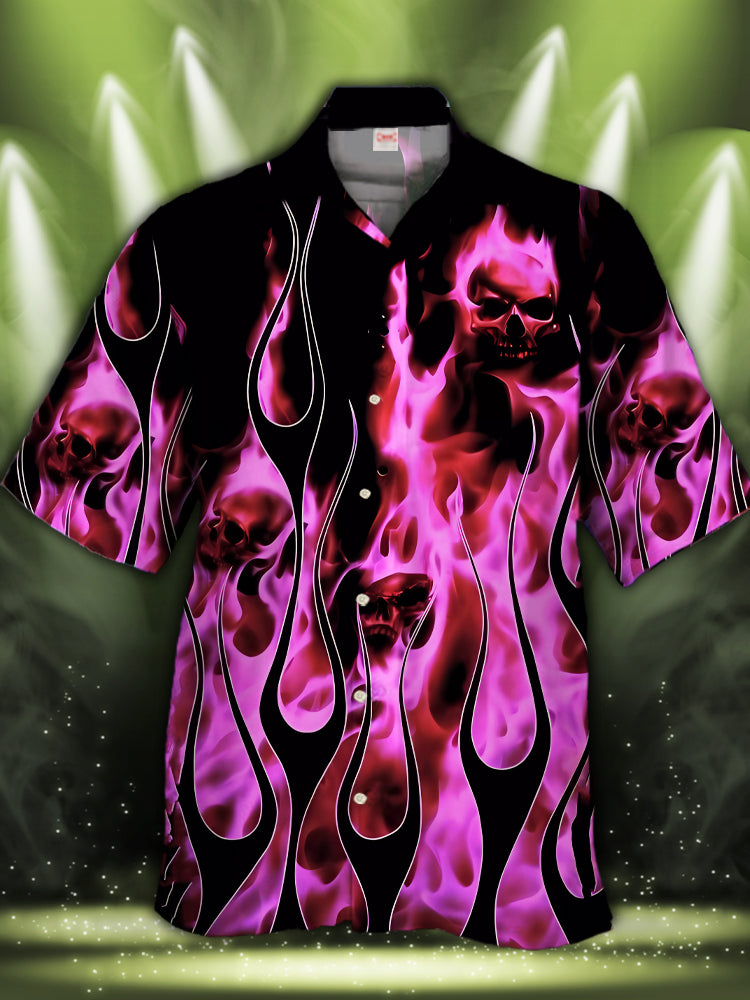 Eye-Catching Pink Flames And Skulls In The Dark Printing Cuban Collar Hawaiian Short Sleeve Shirt