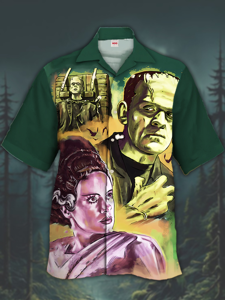 Eye-Catching Green Comic Style Horror Movie Characters Printing Cuban Collar Hawaiian Short Sleeve Shirt