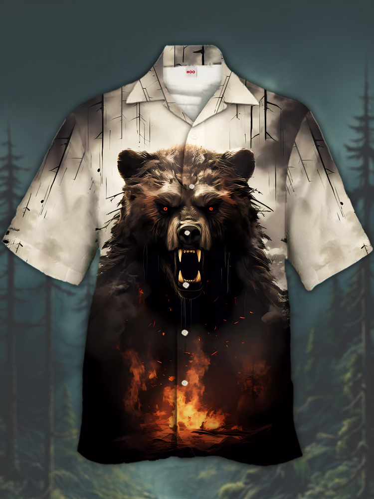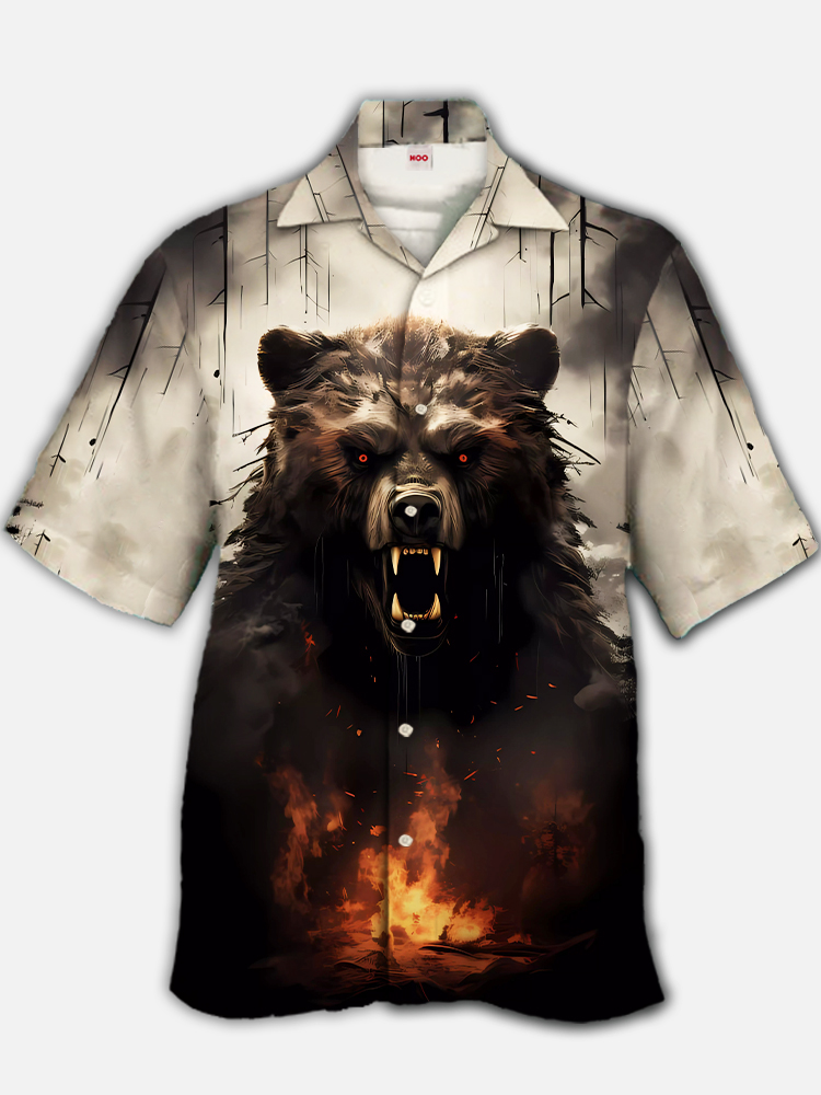 Eye-Catching Mutated Red-Eyed Brown Bear And Forest Flame Printing Cuban Collar Hawaiian Short Sleeve Shirt