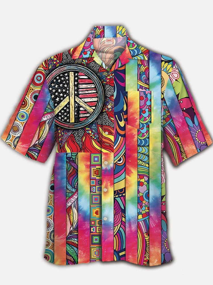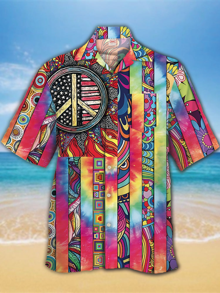 Eye-Catching Psychedelic Hippie Rainbow Peace Sign Flag Printing Breast Pocket Cuban Collar Hawaiian Short Sleeve Shirt