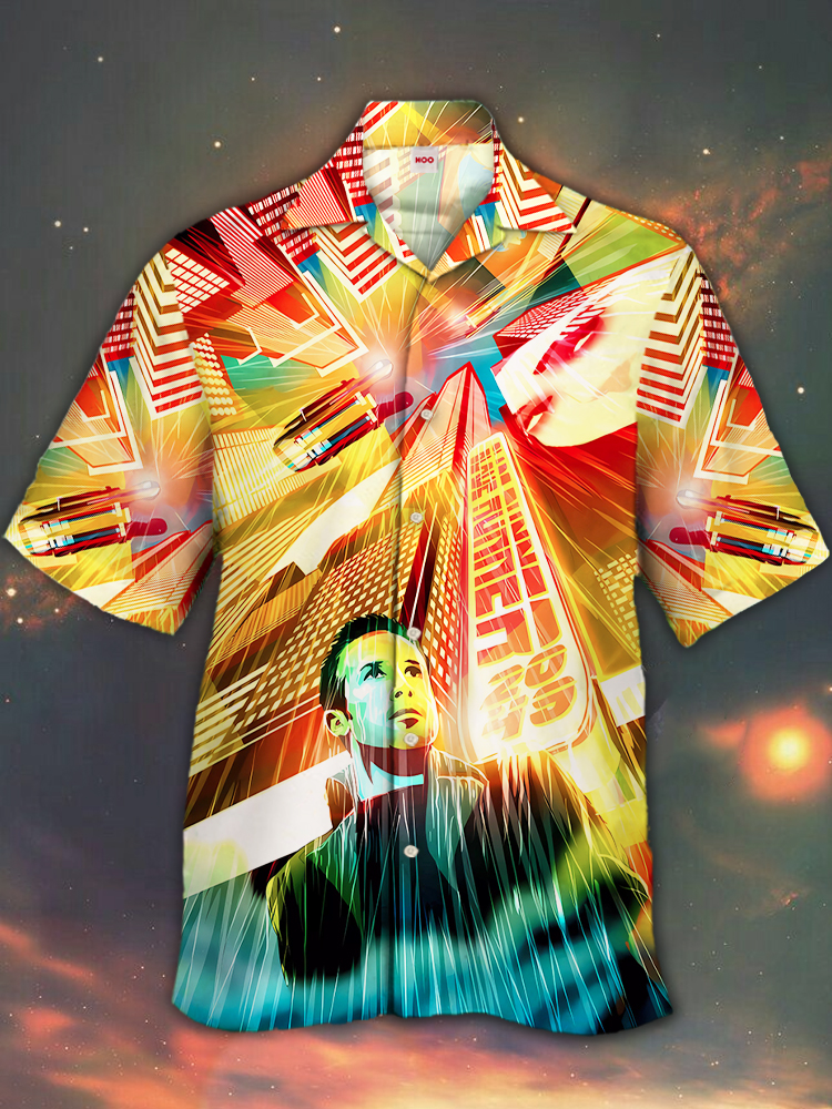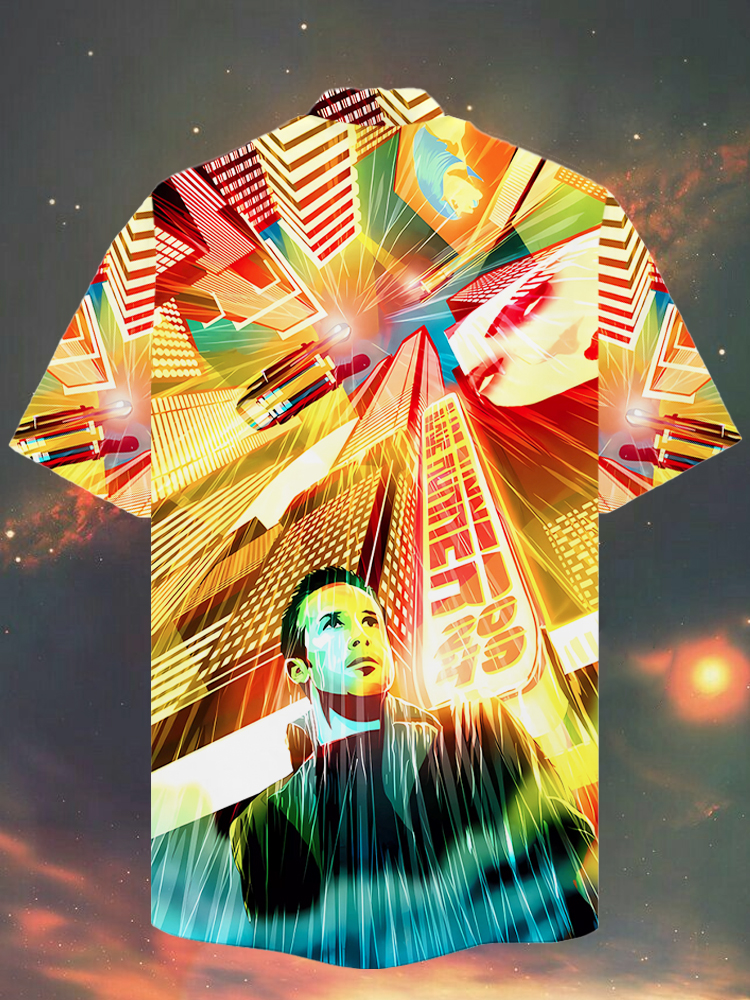 Eye-Catching Abstract City Neon Poster And Character Portrait Printing Cuban Collar Hawaiian Short Sleeve Shirt