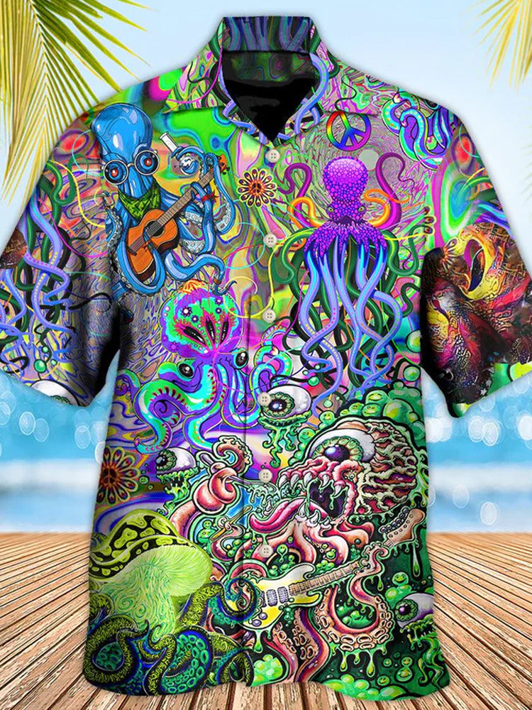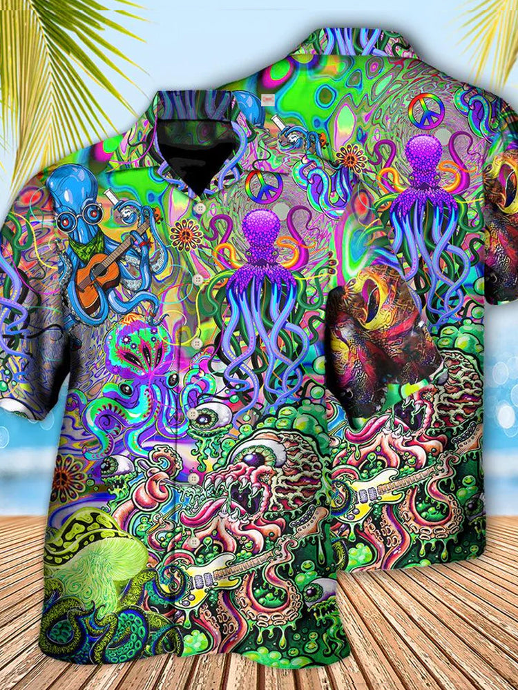 Eye-Catching Psychedelic Hippie Funny Octopus Printing Cuban Collar Hawaiian Short Sleeve Shirt