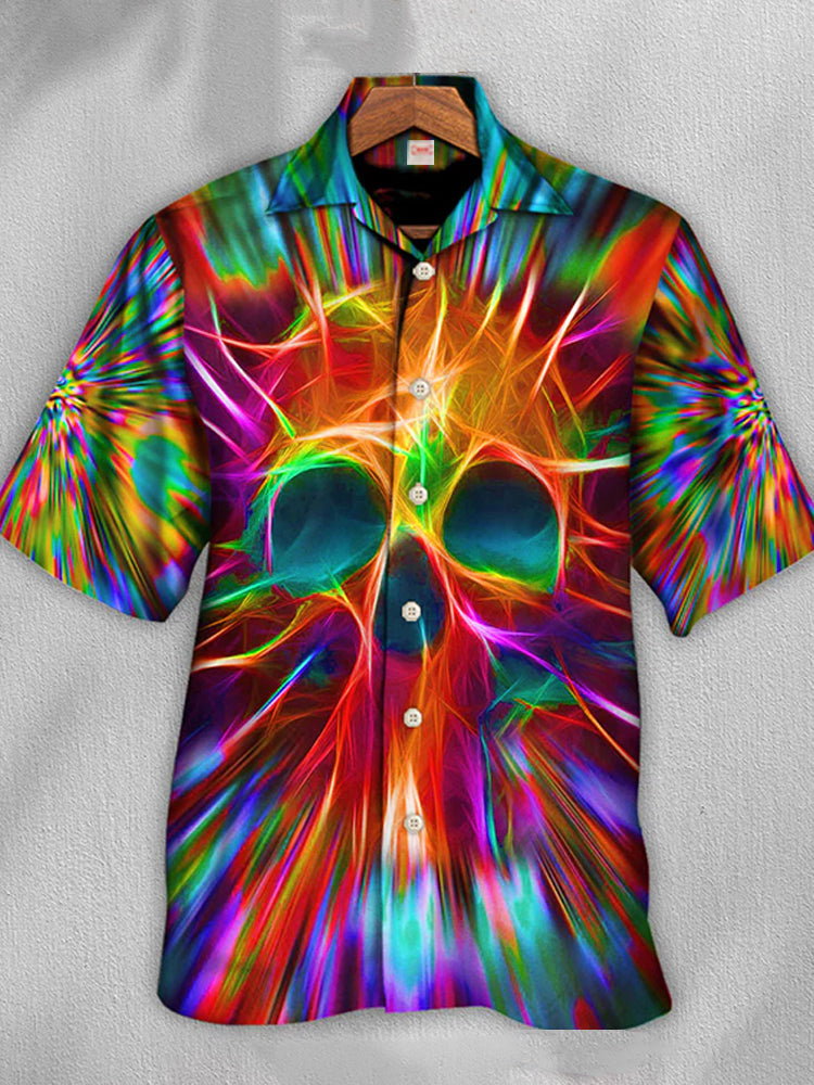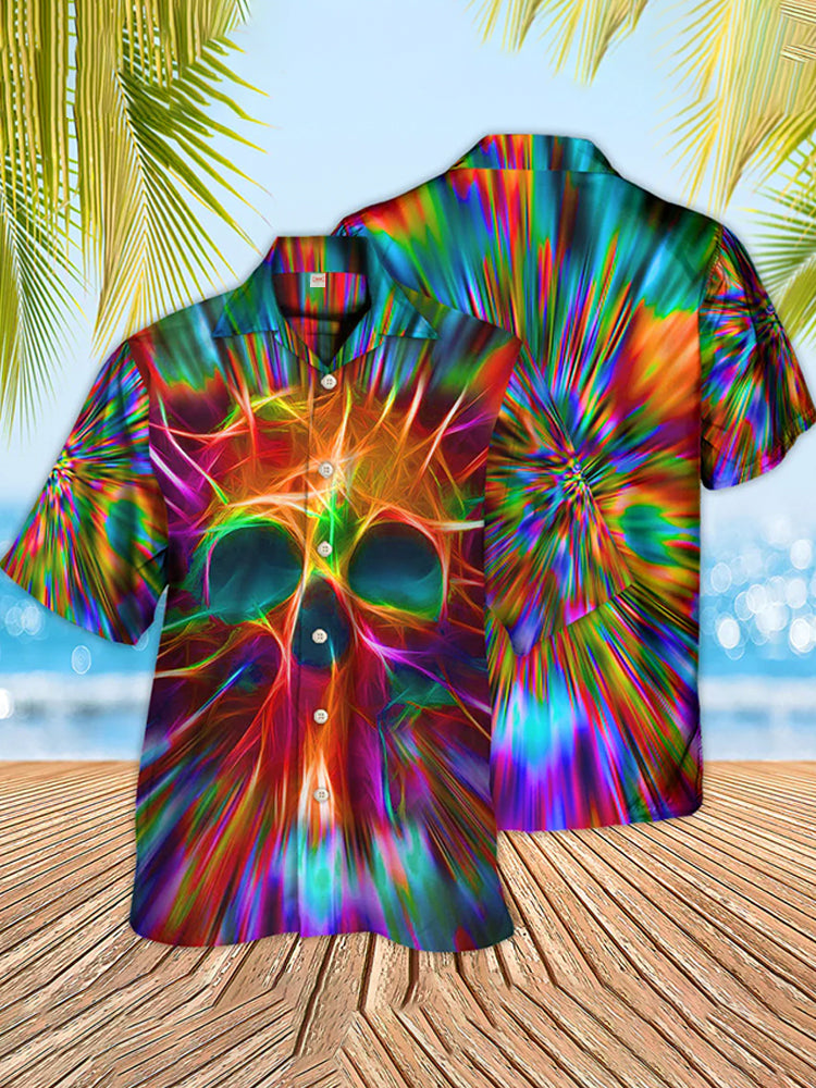 Eye-Catching Rainbow Radiant Skull Printing Cuban Collar Hawaiian Short Sleeve Shirt