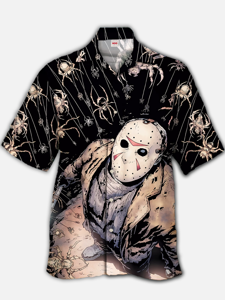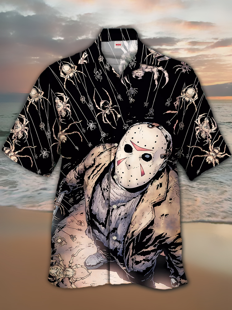 Eye-Catching Horror Style Masked Horror Character And Spiders Printing Cuban Collar Hawaiian Short Sleeve Shirt