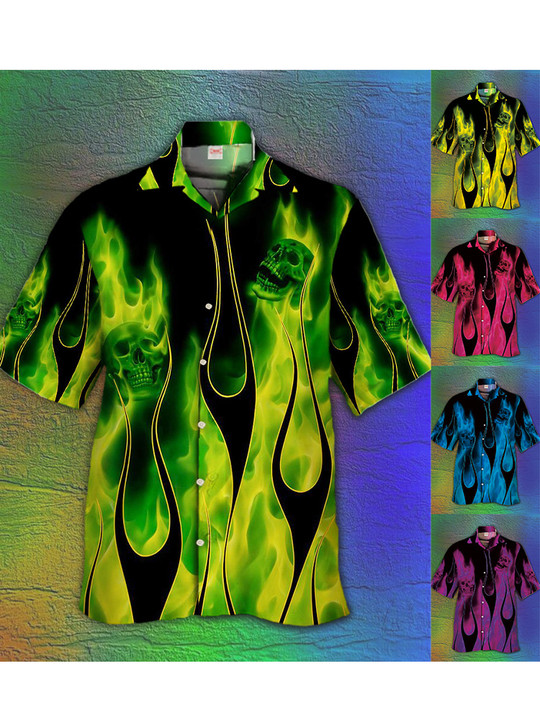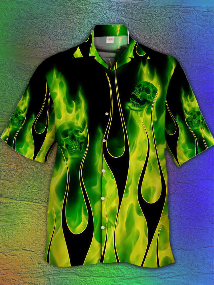 Eye-Catching Psychedelic Green Fire Flame Pattern Printing Cuban Collar Hawaiian Short Sleeve Shirt