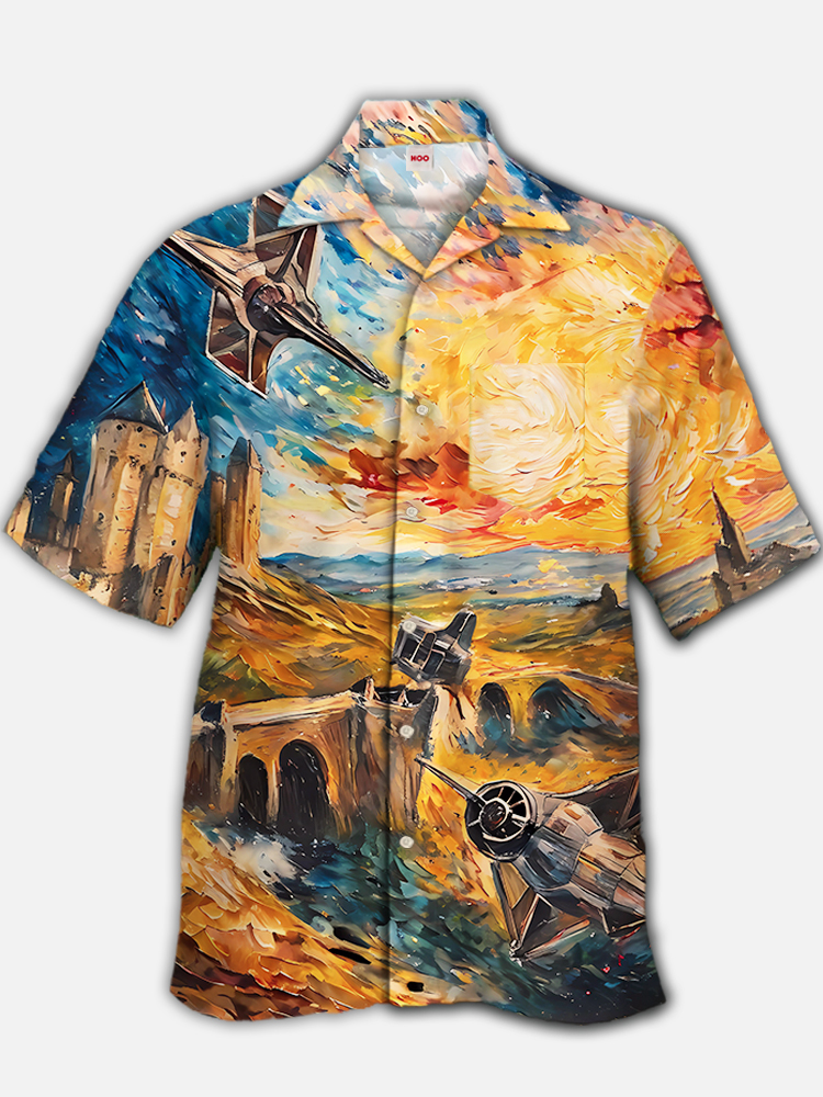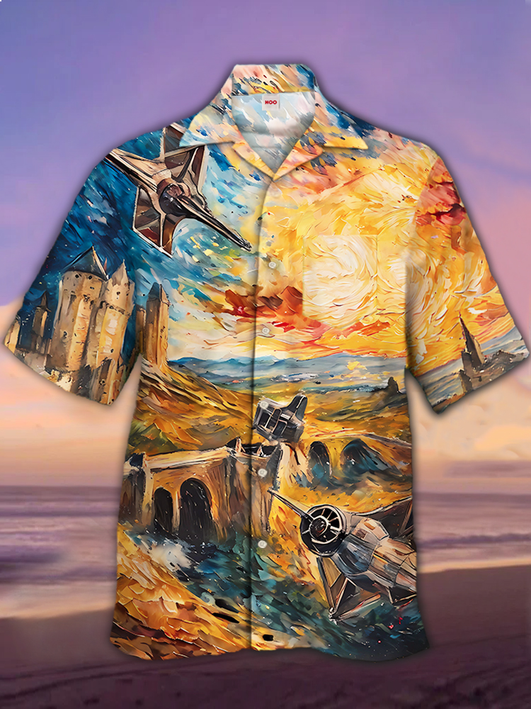 Eye-Catching Oil Painting Style Sci-Fi Fantasy Spaceships And Dams Printing Breast Pocket Cuban Collar Hawaiian Short Sleeve Shirt