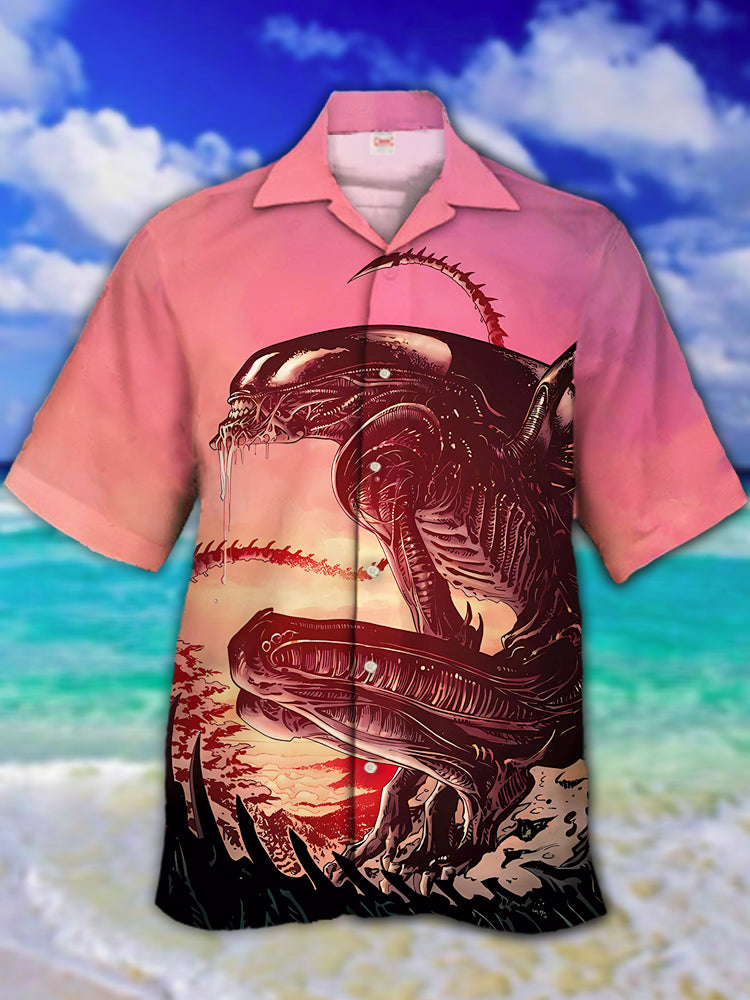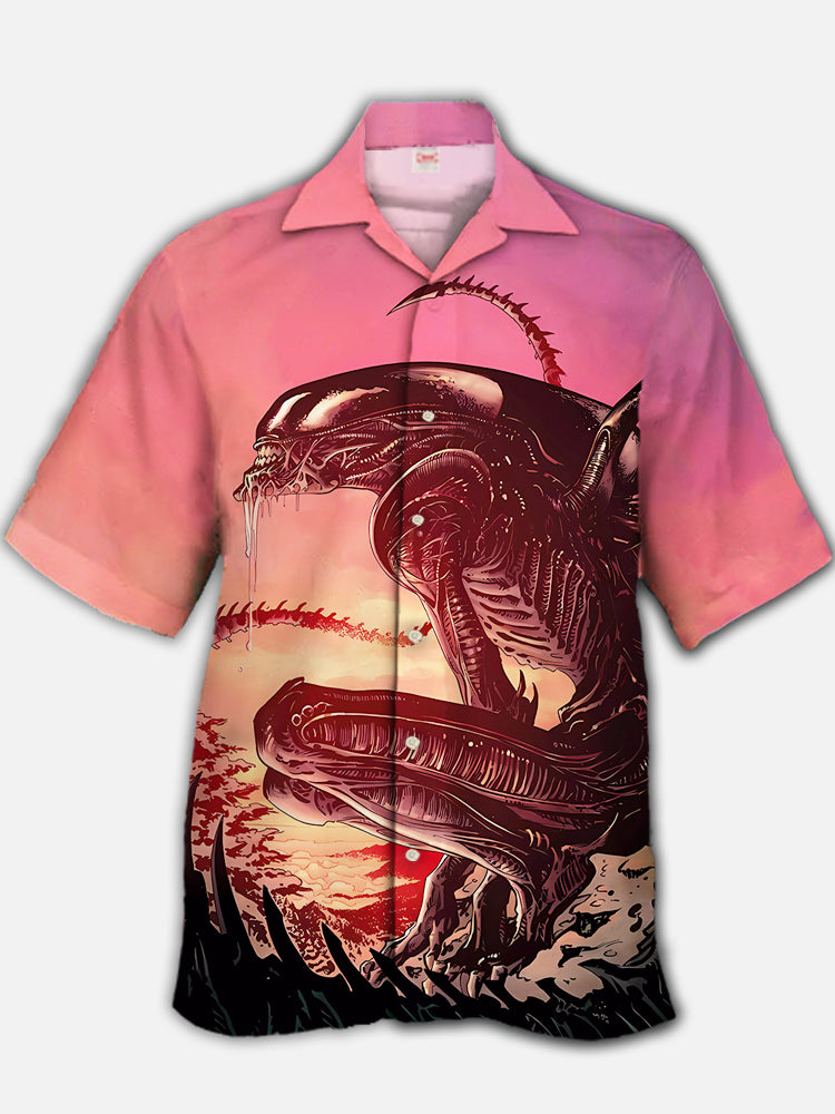 Eye-Catching Gradient Pink Sunrise Sci-Fi Art Alien World Alien Creature Printing Cuban Collar Hawaiian Short Sleeve Shirt