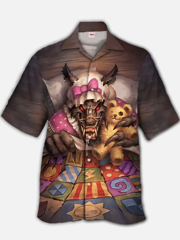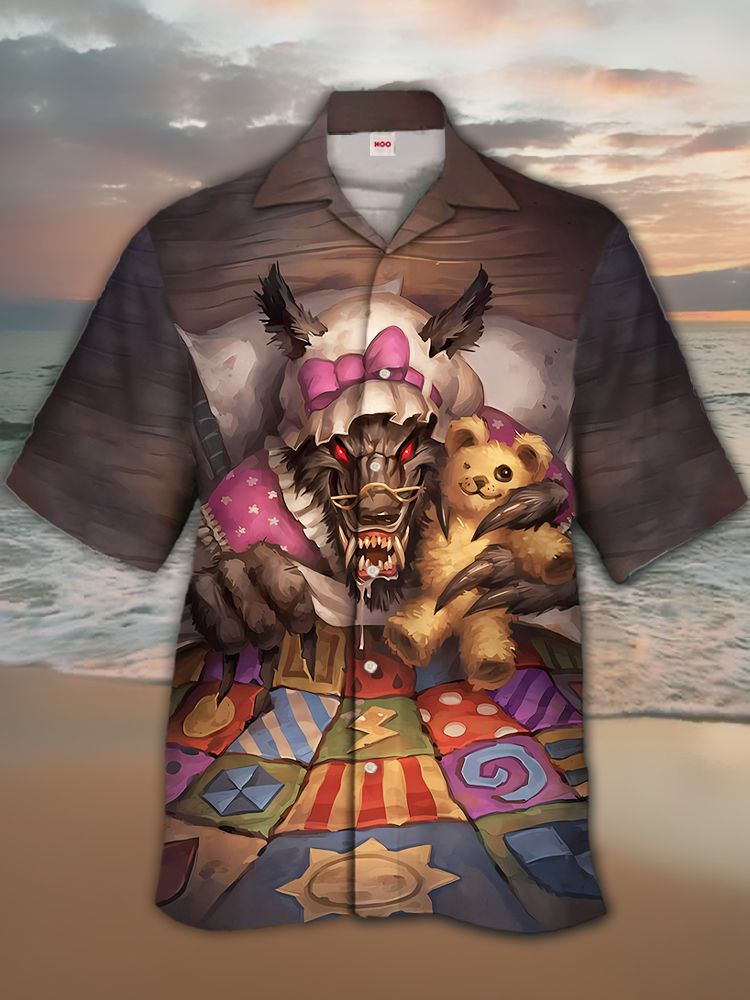 Eye-Catching Horrible Hypocritical Wolf And Teddy Bear Printing Cuban Collar Hawaiian Short Sleeve Shirt